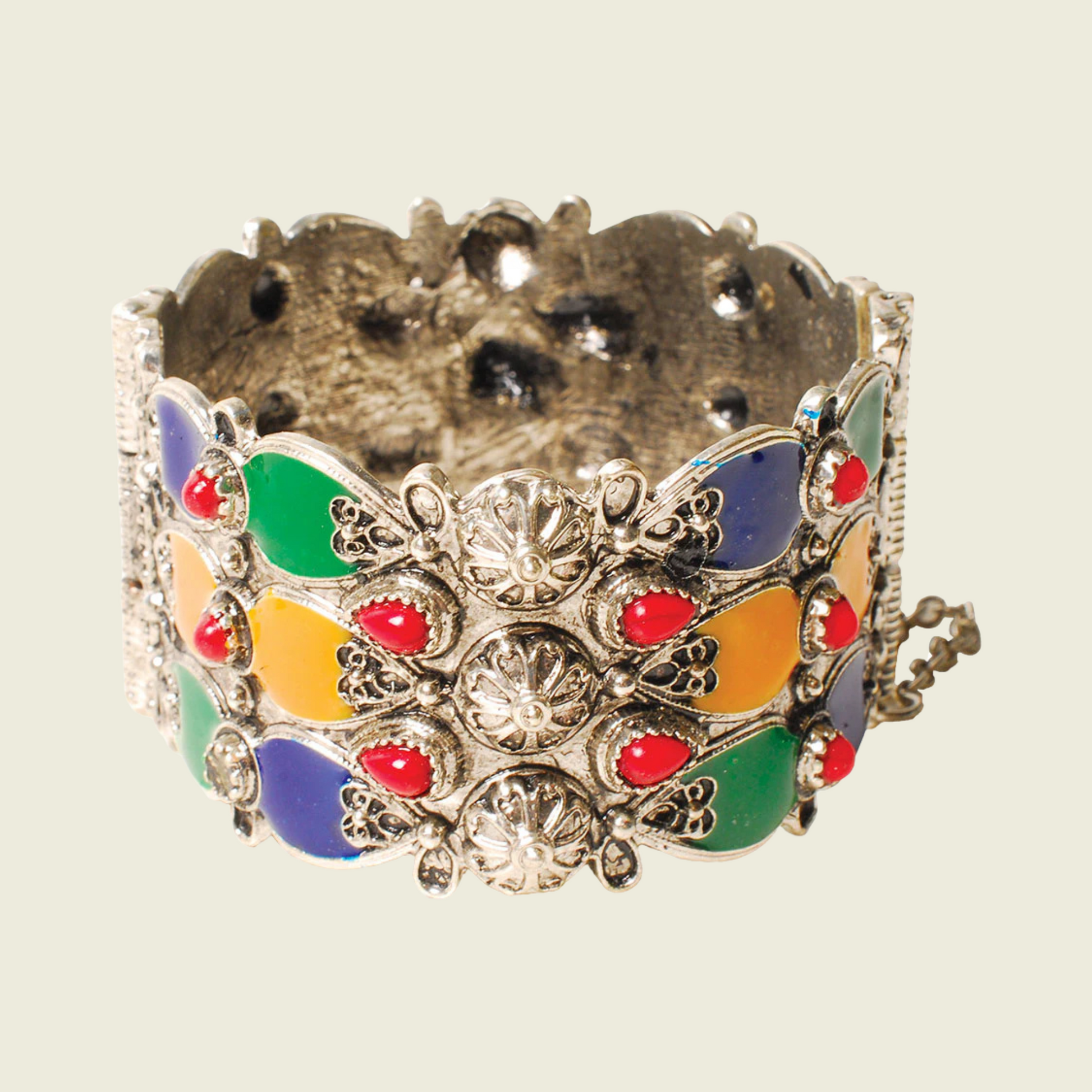 Un Magnifique bijou ethnique réalisé de façon artisanale et traditionnelle. Son décor de motifs plats en forme de larmes cloisonnées met en avant toute une surface métallique finement ciselée et ornée de petites larmes de corail serties dans la tradition des plus beaux bijoux berbères. Ces pierres symbolisent le sang versé par les Berbères pour défendre leur liberté et leur identité, mais aussi l’amour et la passion. Idéal pour sublimer une tenue sobre ou bohème, et pour exprimer votre personnalité et votre originalité. Fermoir traditionnel retenu par une petite chaîne. l. 4 cm.
