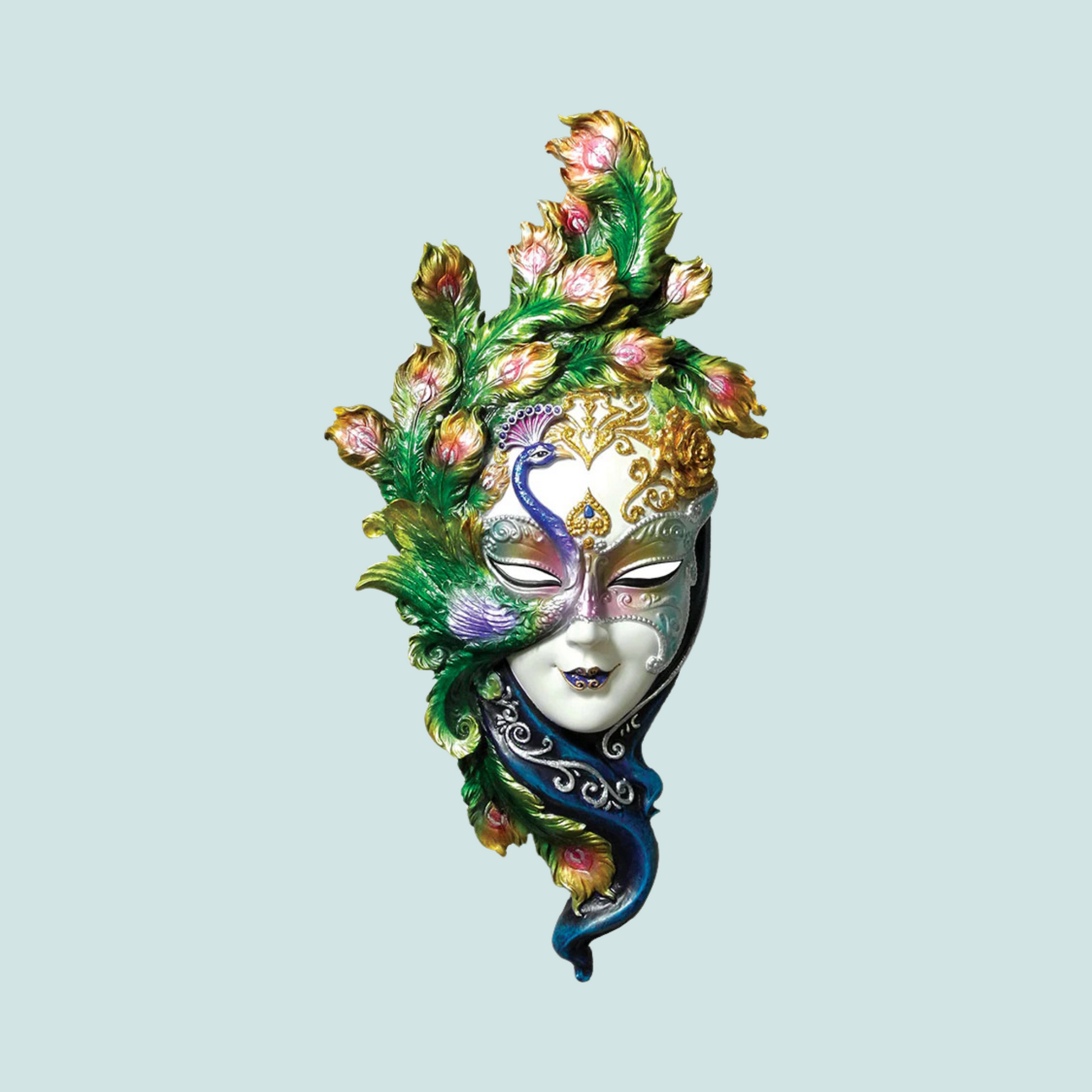 Ce paon majestueux qui s’épanouit dans la coiffure et dont le plumage très coloré aux couleurs vives est magnifique ! Au Carnaval de Venise, les plumes de Paon sont souvent utilisées pour décorer les masques, car elles symbolisent la beauté, la fierté et la noblesse. Les yeux des plumes de paon permettraient aussi de se protéger du mauvais œil, en renvoyant les énergies négatives à leur source. Dans l’Antiquité le paon était associé à la déesse grecque Héra, qui représentait le pouvoir et la royauté, les yeux de ses plumes évoquant la vigilance et la sagesse. Résine, Système accroche au dos – patine artisanale et décors peints main. L. 33 cm