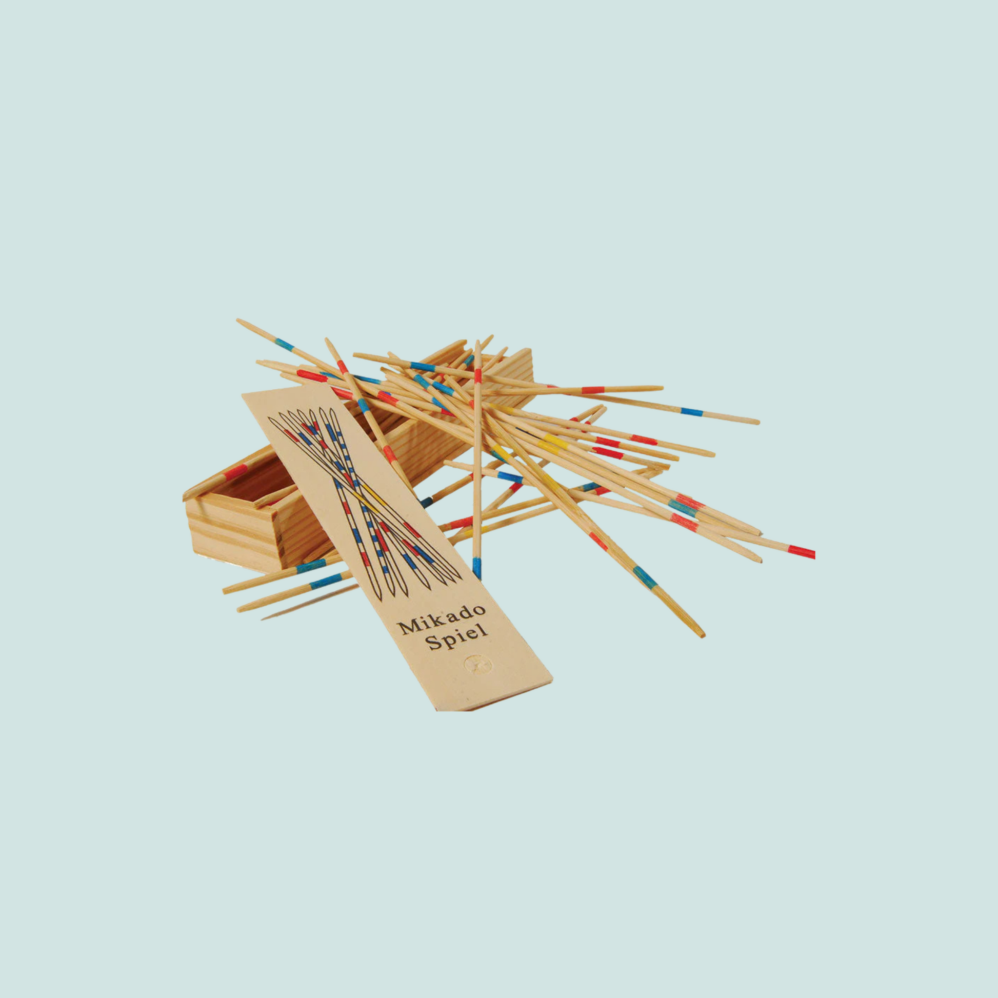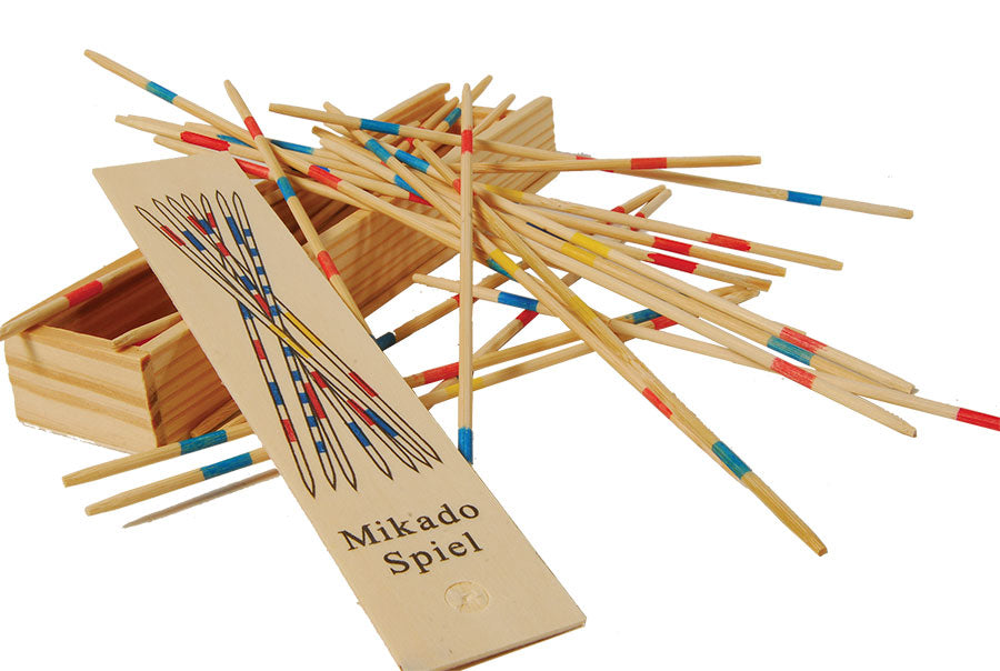Le mikado est un jeu d’adresse qui se joue de 2 à 6 personnes. Composé de baguettes en bois d’environ 20 cm aux extrémités effilées, que l’on laisse tomber de façon à ce qu’elles s’enchevêtrent, avant de les retirer une à une sans faire bouger les autres. Les couleurs indiquent leur valeur. Dans une jolie boîte en bois. L. 19,5 cm