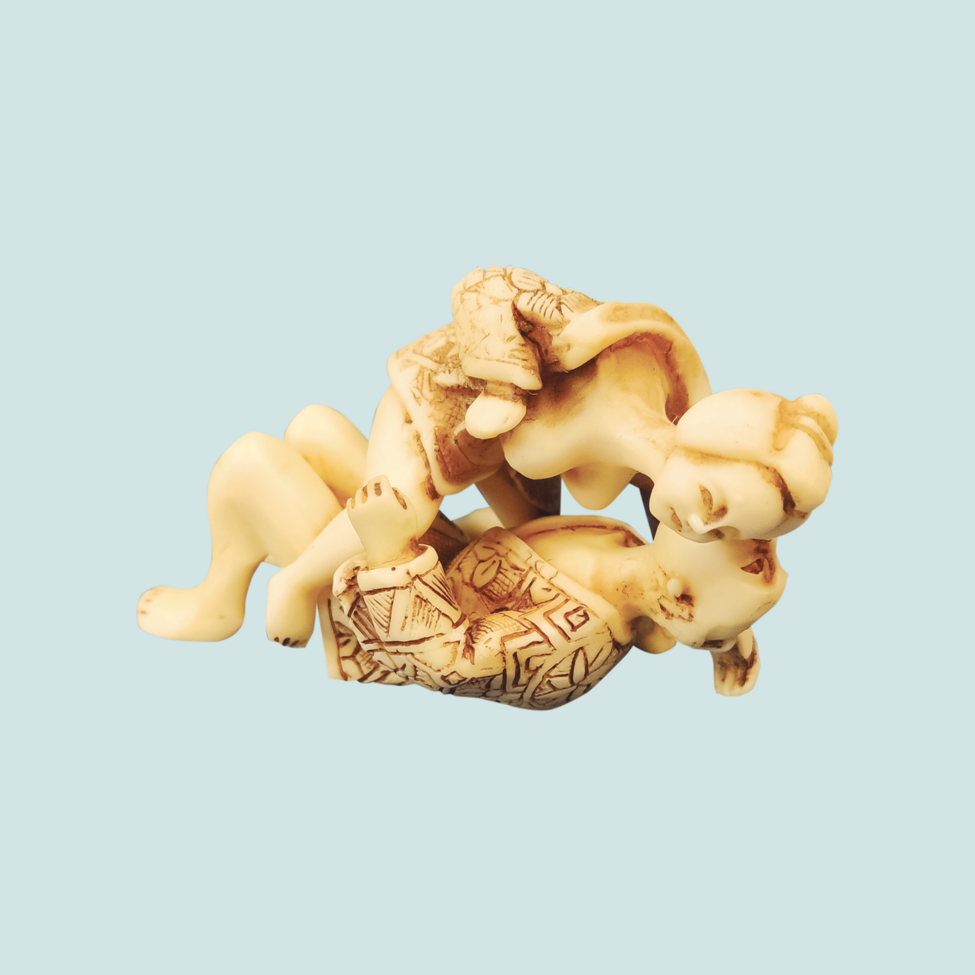 Si les netsukés représentaient souvent des animaux ou des créatures mythologiques, il en existe d’un tout autre genre… les netsuke érotiques. Une réédition d'Antan des témoins insoupçonnés d'un japon censuré. Kamasutra ivoirine, sculptés artisanalement. Stock limité - L. 6 cm.
