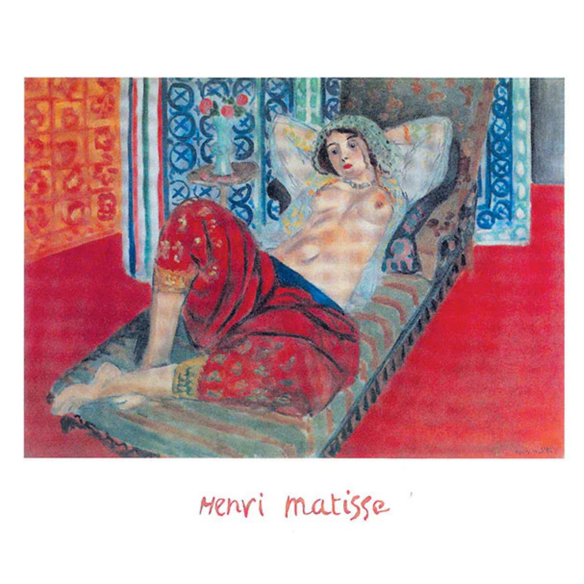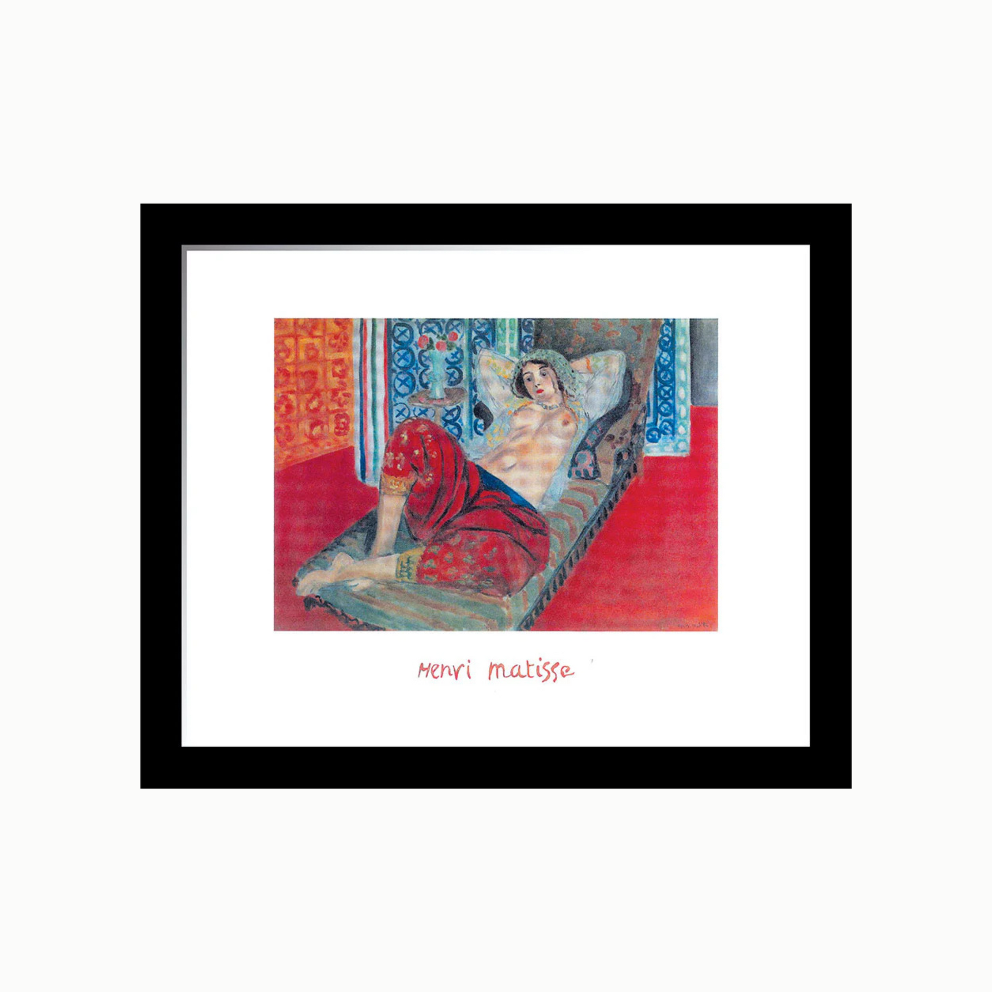 Très belle reproduction de Henri Matisse (1869 – 1954) d’une huile sur toile (67 x 84 cm) intitulée « Odalisque à la culotte rouge et au buste dénudé » réalisée en 1921 et exposée au centre Pompidou à Paris. Système de fixation au dos permettant un accrochage immédiat. Cadre en bois laqué mat. Verre organique (incassable). 27 x 33 cm.