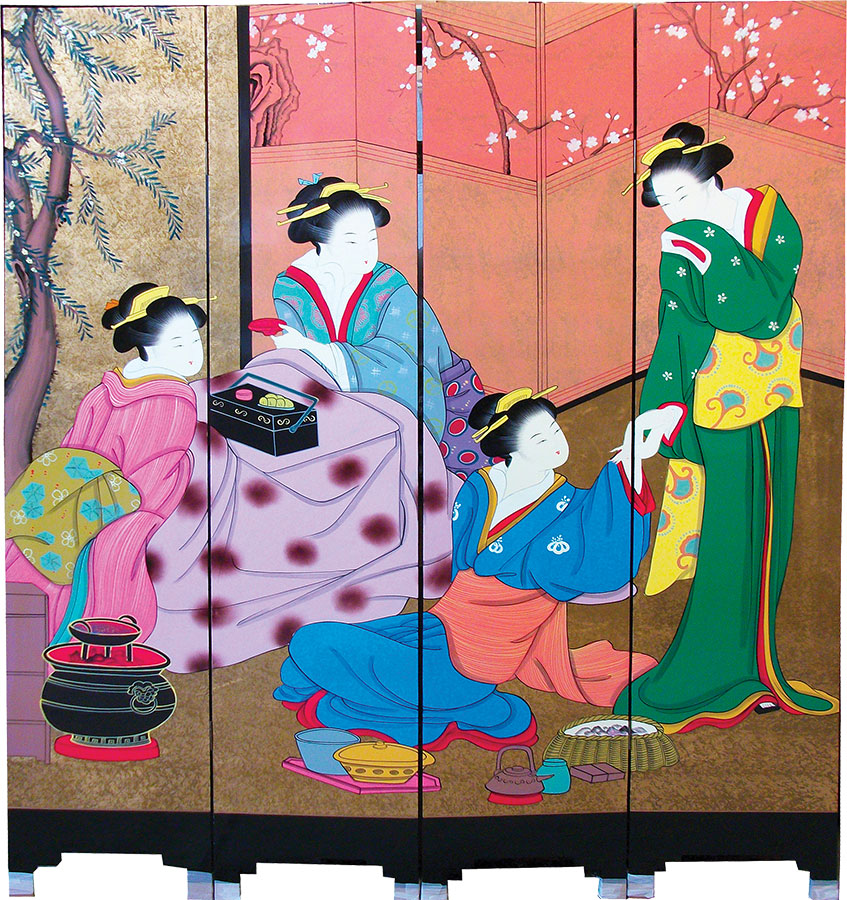 Cette pièce d’exception incarne l’élégance et la beauté intemporelle de la Chine des Empereurs. Chaque panneau est une œuvre d’art, avec des détails minutieux et un relief raffiné. Ce ravissant décor est entièrement réalisé à la main sur Feuille de Cuivre comme autrefois dans la Chine ancienne. Le mariage de cette technique (Feuille de cuivre et laque) est Magnifique, la feuille de cuivre apportant luminosité et sophistication, tandis que la laque assure durabilité et protection. La scène des geishas est remplie de grâce et la délicatesse avec une riche palette de couleurs. Le col en V et les manches relevables ajoutent une touche empreinte d’histoire. Ce paravent est bien plus qu’un simple objet de décoration. C’est une invitation à voyager dans le temps et à apprécier l’artisanat d’antan. Dimensions par panneau : 40 cm x H 180 cm. Nbre de panneaux 4. Seulement deux paravents disponibles.