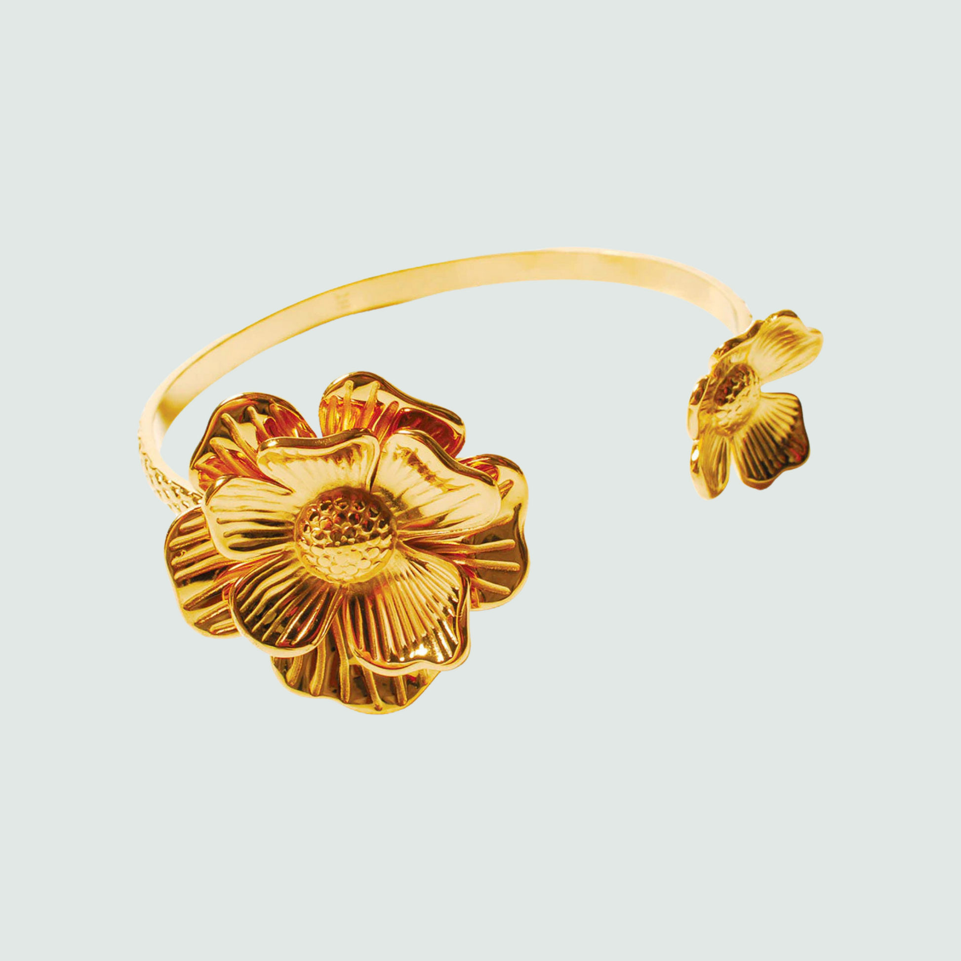 Finement travaillé avec un petit relief extérieur peau de serpent, ce bracelet est typique de l’Art Nouveau. À chaque extrémité du bracelet, une anémone délicate et raffinée vient orner votre poignet (D. 3 cm. et 1,8 cm.). La bague assortie est ravissante ! (Fleur 2 cm. et 1 cm. s’adapte à tous les doigts). Boucles d’oreilles et collier viennent compléter cette création unique qui vous fera voyager dans le temps et dans l’art. Acier doré or fin, un matériau noble et durable.