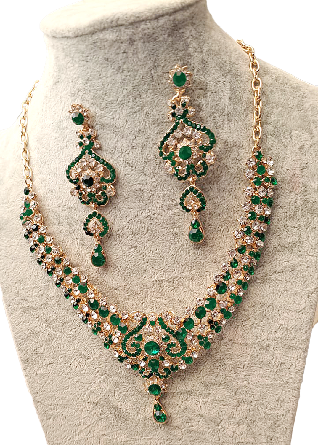 | Des diams en cascade, rehaussés de somptueuses gouttes émeraude. Strass et cristal facetté sur métal doré or fin. 45 cm + chaîne d'appoint 5 cm. Boucles pour oreilles percées 7 cm. Avec chaînette délicate, à fixer dans les cheveux 12 cm |