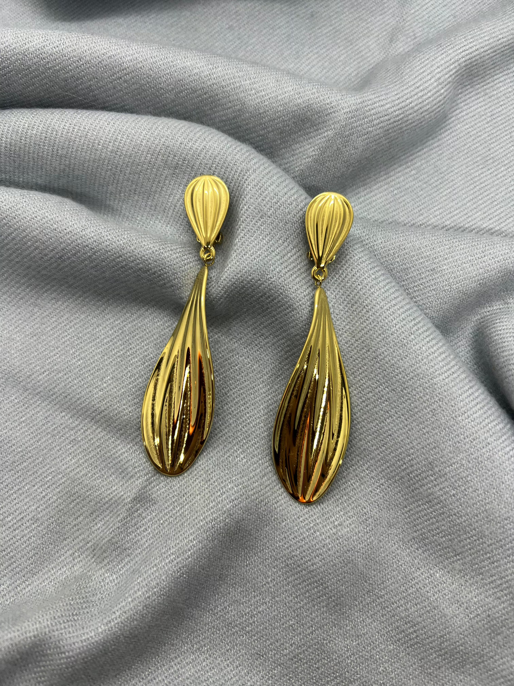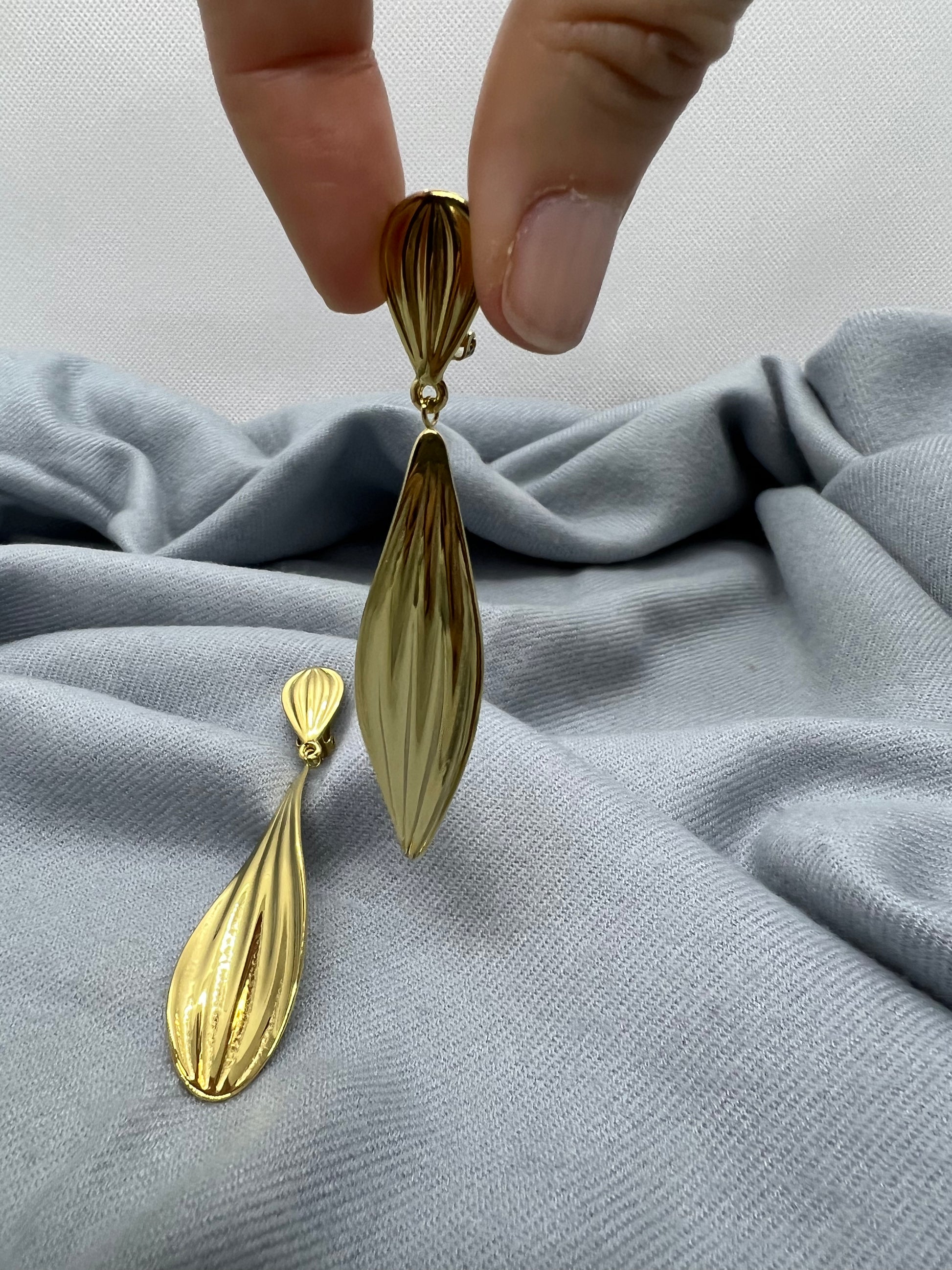 D’une modernité assumée elles revisitent avec talent les pendants des années 1900 – 1920. Elles sont magnifiques ! creuses et légères, elles sont en Acier inoxydable doré or fin, gage de qualité. Oreilles percées – 7,5 x 2 cm.