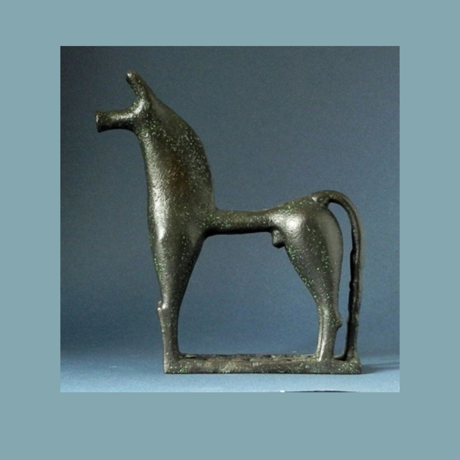 Vers 900 avant J.C. s’est produit un schisme dans le style de l’art antique grec. tendance qui fut bien vite reprise par les sculpteurs. Le cheval était un sujet idéal pour exprimer cette simplification géométrique et innovatrice. Il en reste surtout le caractéristique “groin”, les oreilles pointues et les évidements triangulaires dans les pieds de la figurine. Ces petits chevaux servaient parfois de décoration sur les vases mais étaient en soi des sculptures séparées souvent utilisées sur les sépultures. Résine patinée bronze