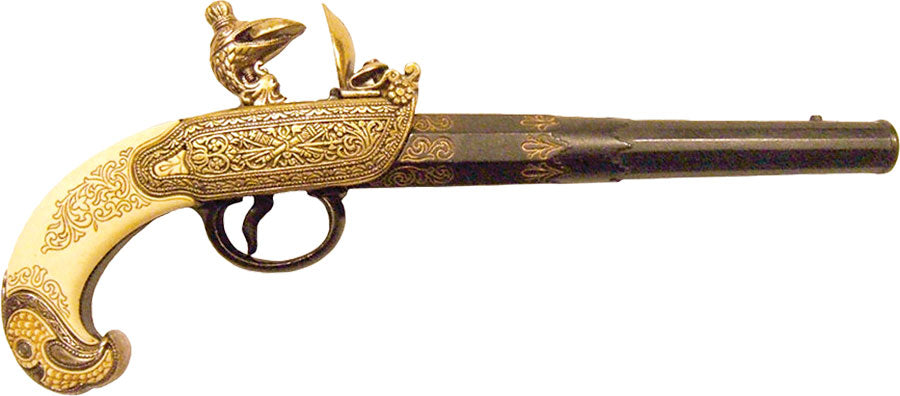 Le pistolet russe XVIIIe siècle est une arme de poing destinée aux officiers et aux dignitaires russes. Il est décoré avec des motifs floraux et géométriques, qui reflètent le goût et l’élégance de l’époque. La crosse est en bois sculpté et la garde est en forme de D. Le canon est octogonal et porte le poinçon de Tula. Le pistolet russe XVIIIe siècle est un objet de collection et de décoration