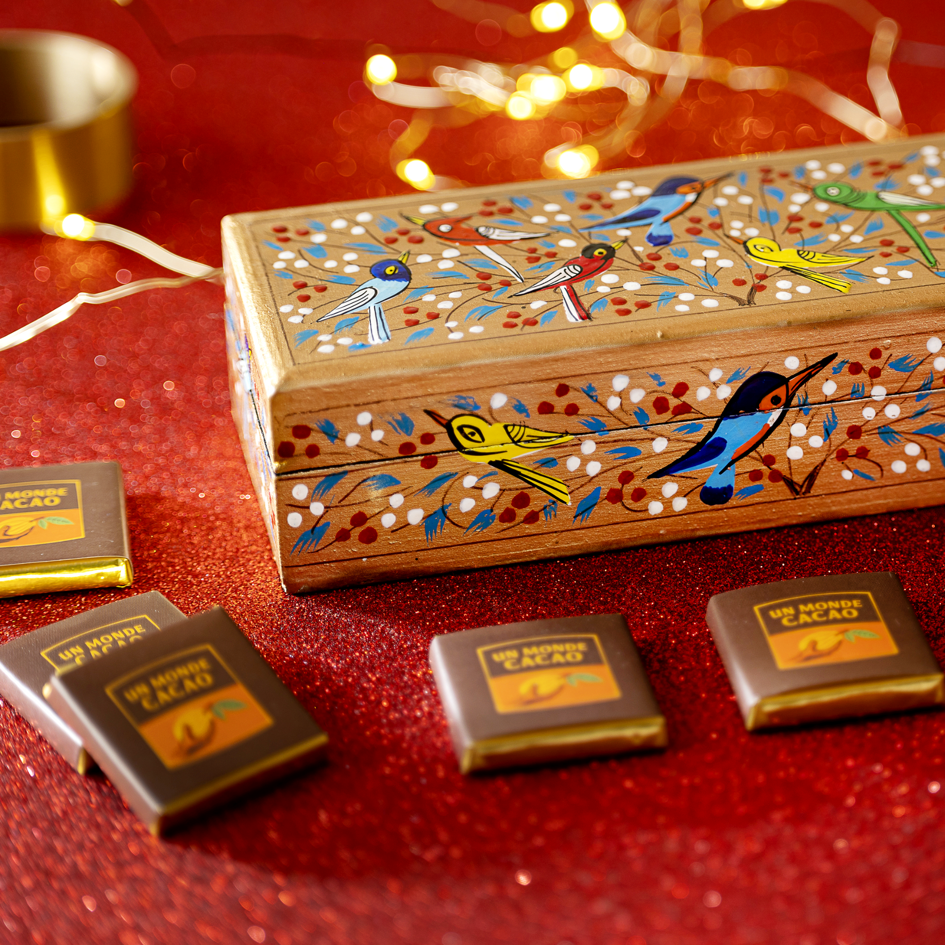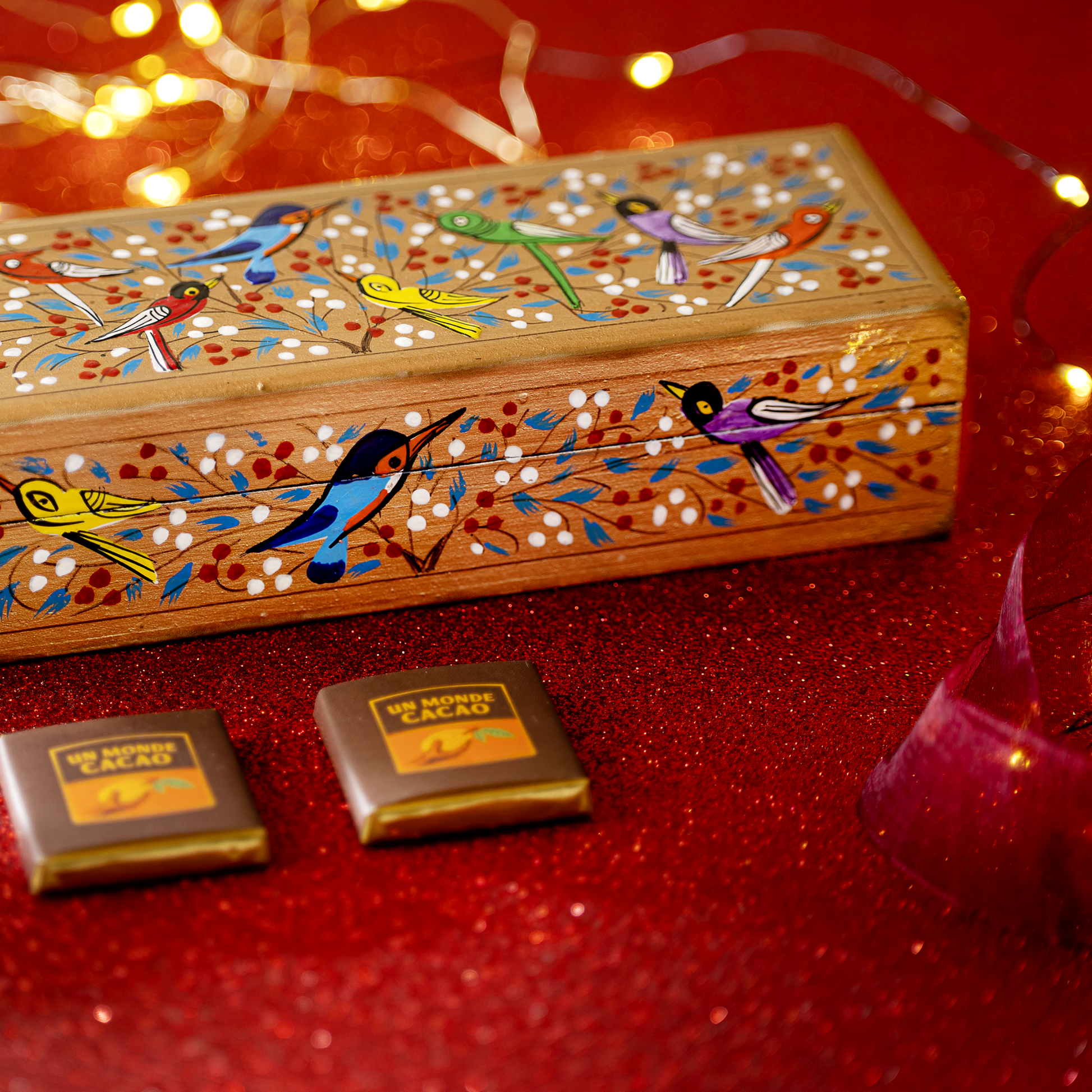 Entièrement fabriquées et peintes à la main, ces Magnifiques boîtes accueillent 100 grs de délicieux Napolitains (chocolat noir 70 % cacao - Labellisés Bio et commerce équitable). Une occasion festive d’exception, un très beau cadeau ! Cet artisanat traditionnel du Cachemire est originaire de Perse. Depuis le XVIe siècle les artisans perpétuent ce savoir-faire de l’époque moghole.