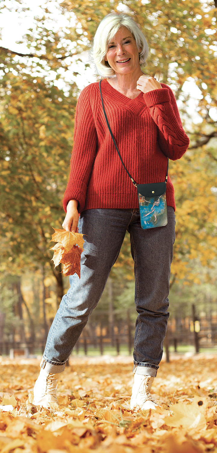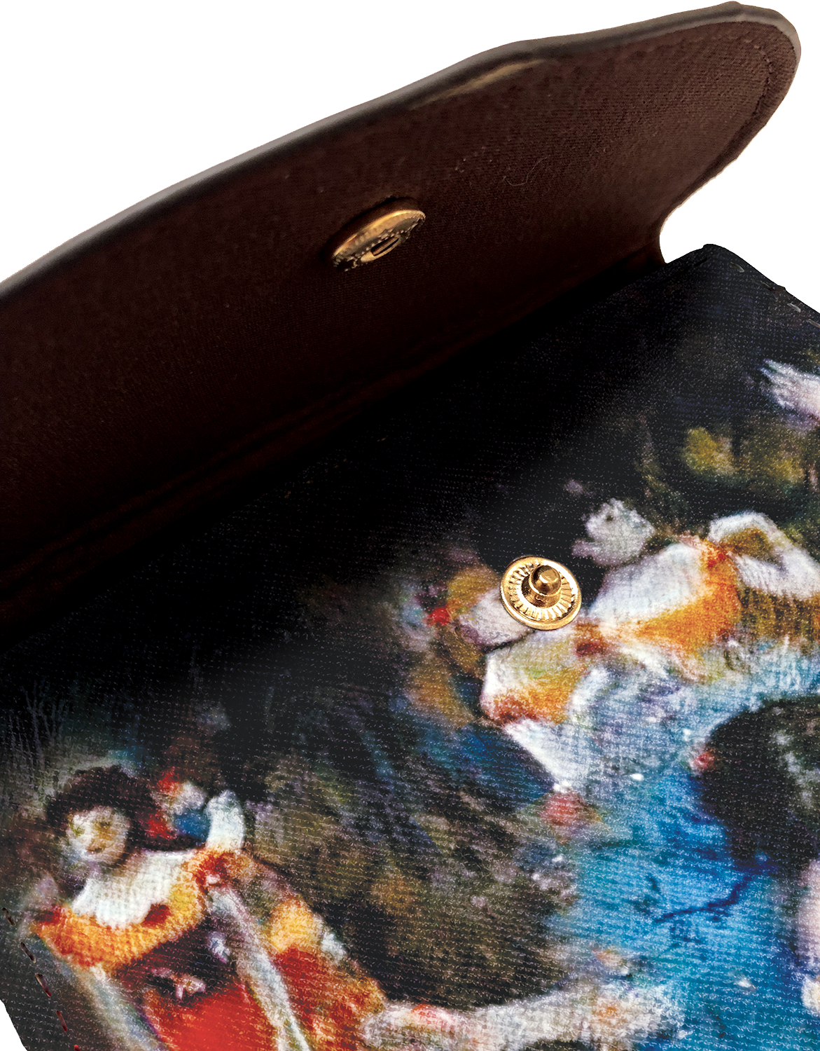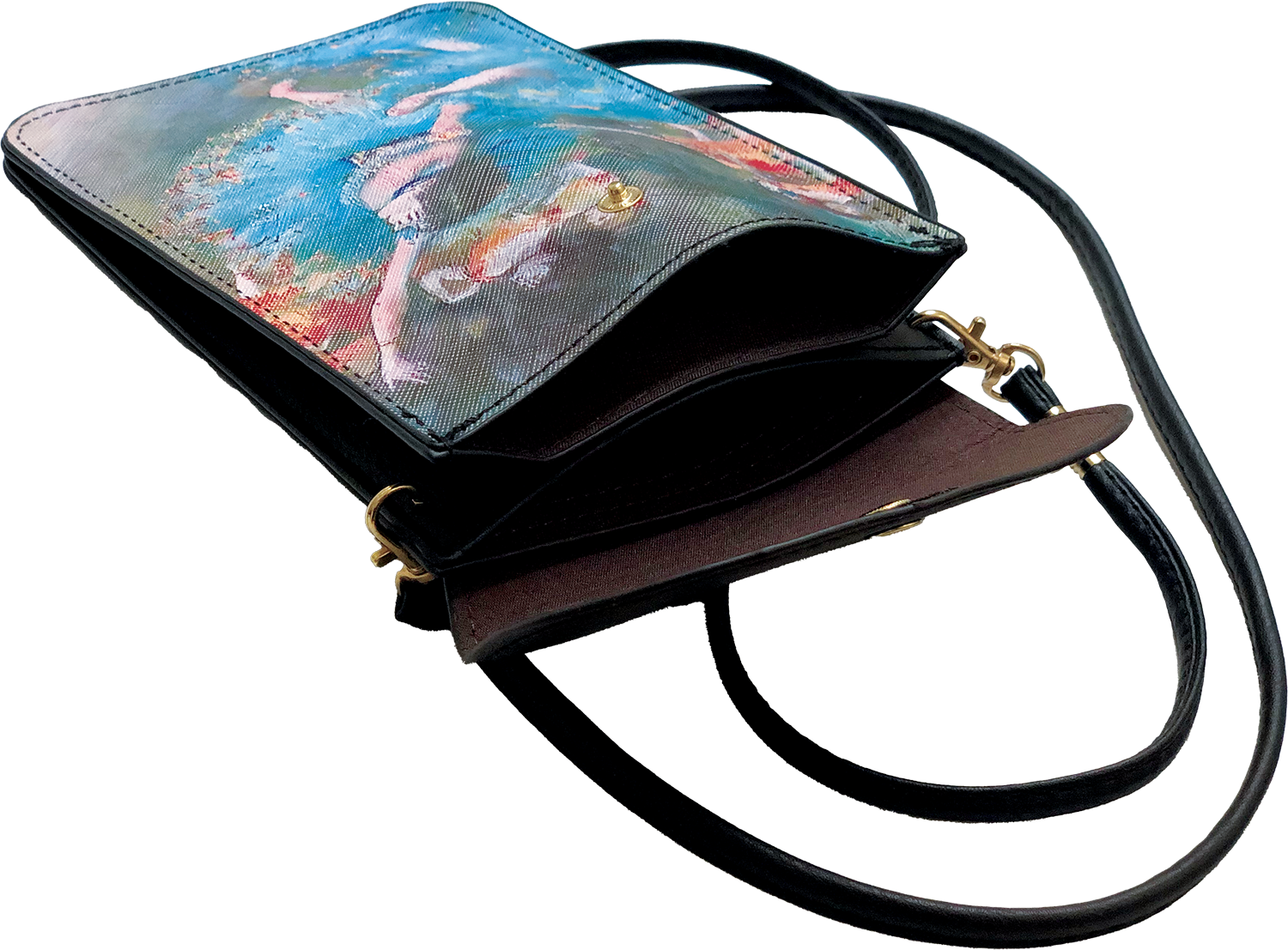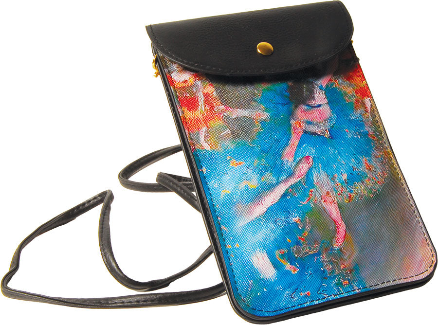 Elle est tout simplement belle avec cette danseuse en plein mouvement reprise du tableau de DEGAS « La danseuse inclinée » (pastel et gouache sur papier-1877) qui lui apporte fraicheur et gaieté . Son rabat avec pression s’ouvre sur deux poches intérieures qui accueilleront votre téléphone et vos papiers. Grande lanière (1,25 m) permettant de la porter en bandoulière. Ferrures dorées - Belle imitation cuir. Synthétique doublé textile. 19 x 12 cm.