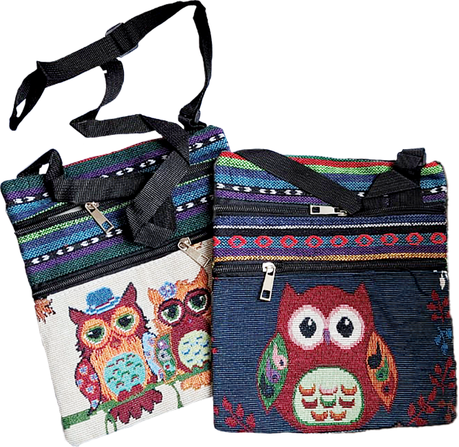 De belle taille (25 x 22 cm) cette pochette - sac est entièrement brodée (recto et verso) Elle est très pratique et sort de l’ordinaire. Elle est Magnifique ! Son motif chouettes sur le devant est très réussi. Le dos est entièrement brodé dans le style des broderies à motifs géométriques des étoffes d’Amérique du sud. Les 2 grandes poches sur le devant sont entièrement doublées. Bandoulière réglable et les motifs chouette assortis sont tous très beaux.