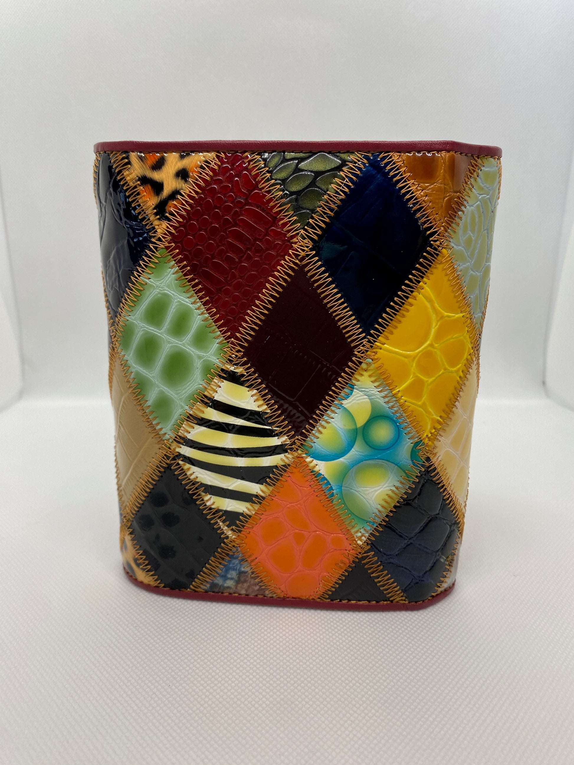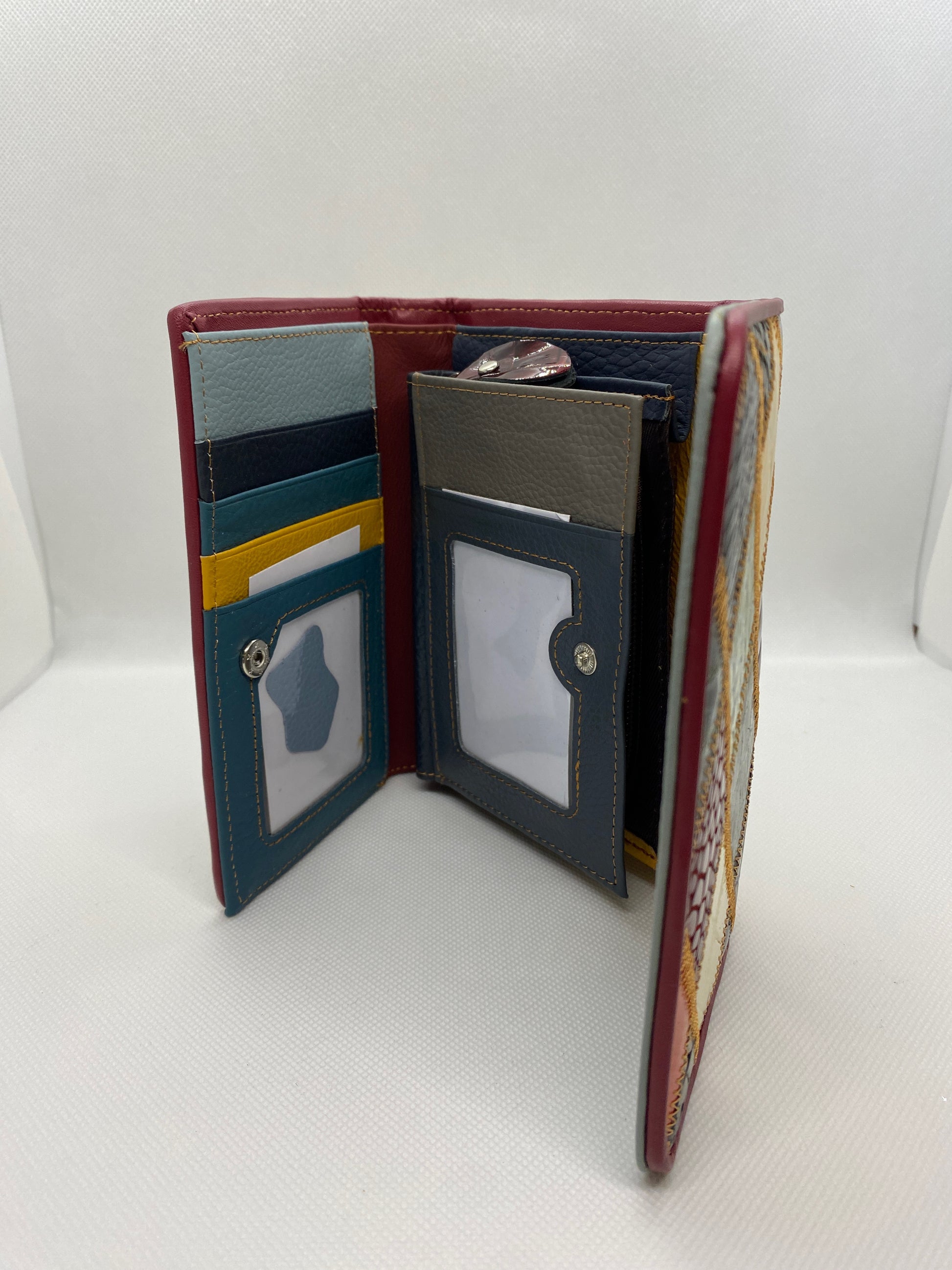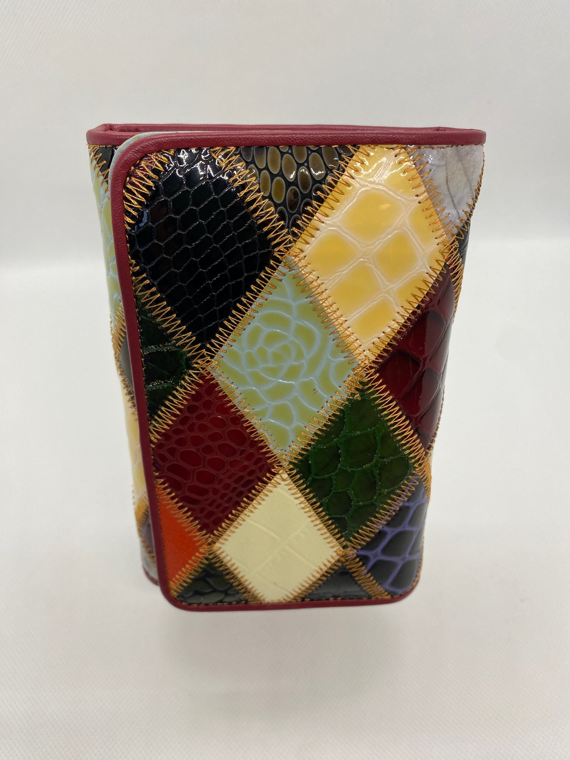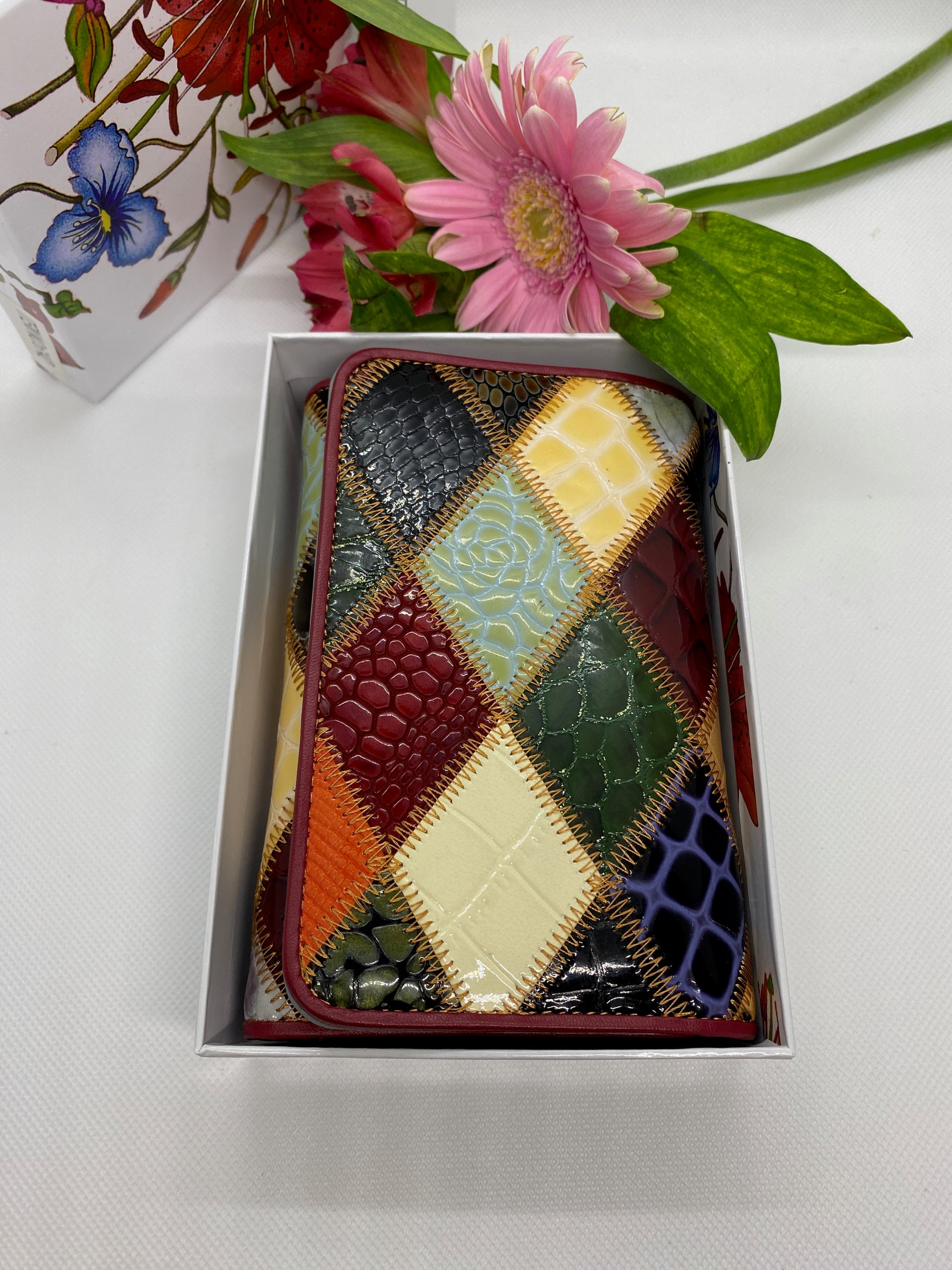 Réalisé par un styliste Florentin ce patchwork de cuir laqué est Magnifique ! Très joli portefeuille multicolore en 3 parties : Porte-monnaie zippé, accueille 8 cartes – 2 poches à soufflets, 3 plaquées. 2 grandes poches pour billets et papiers identité. Fermeture languette rabat à pression. Bel objet très féminin. Livré dans boîte fleurie élégante. 14 x 9 x 3 cm.