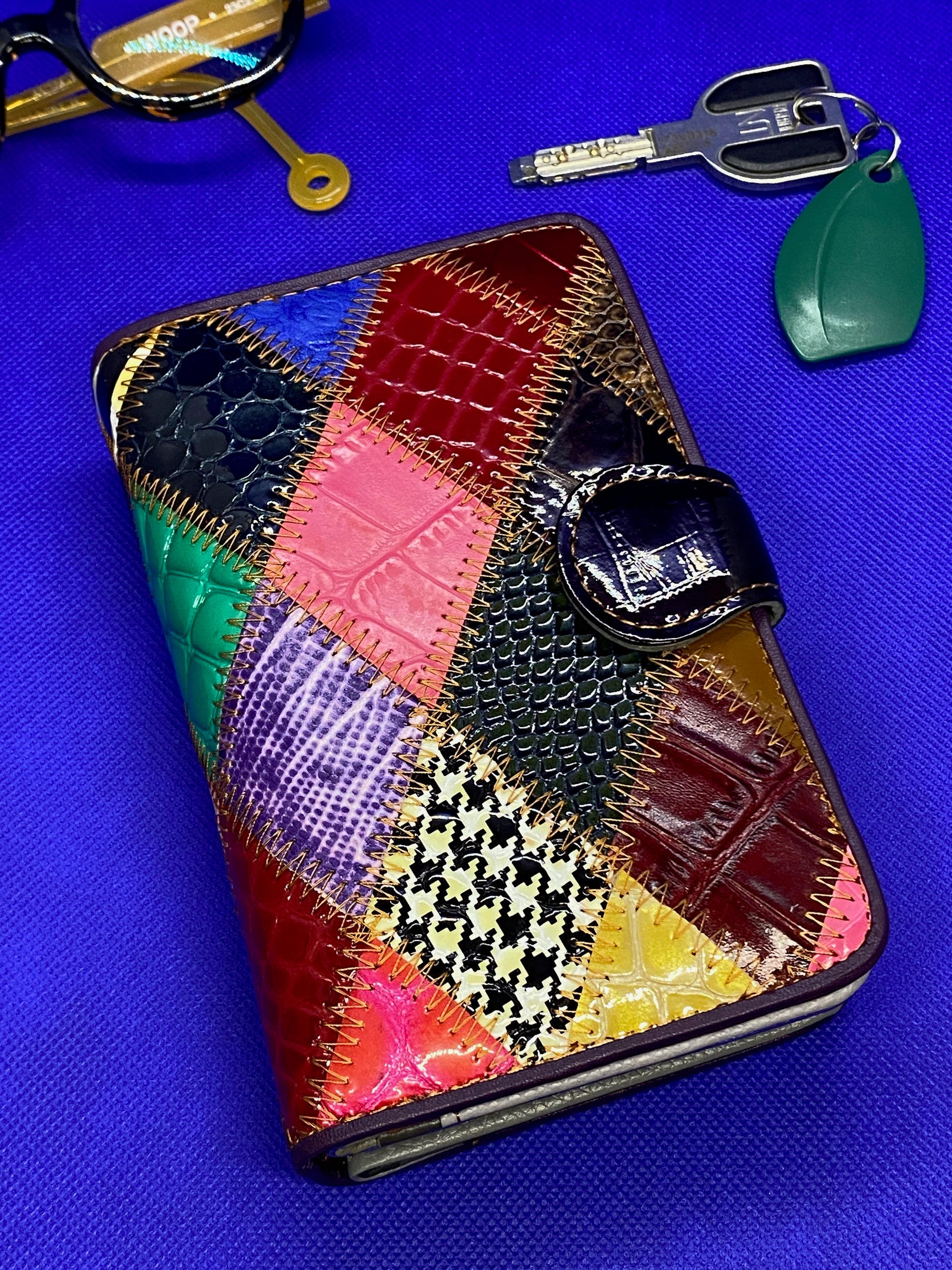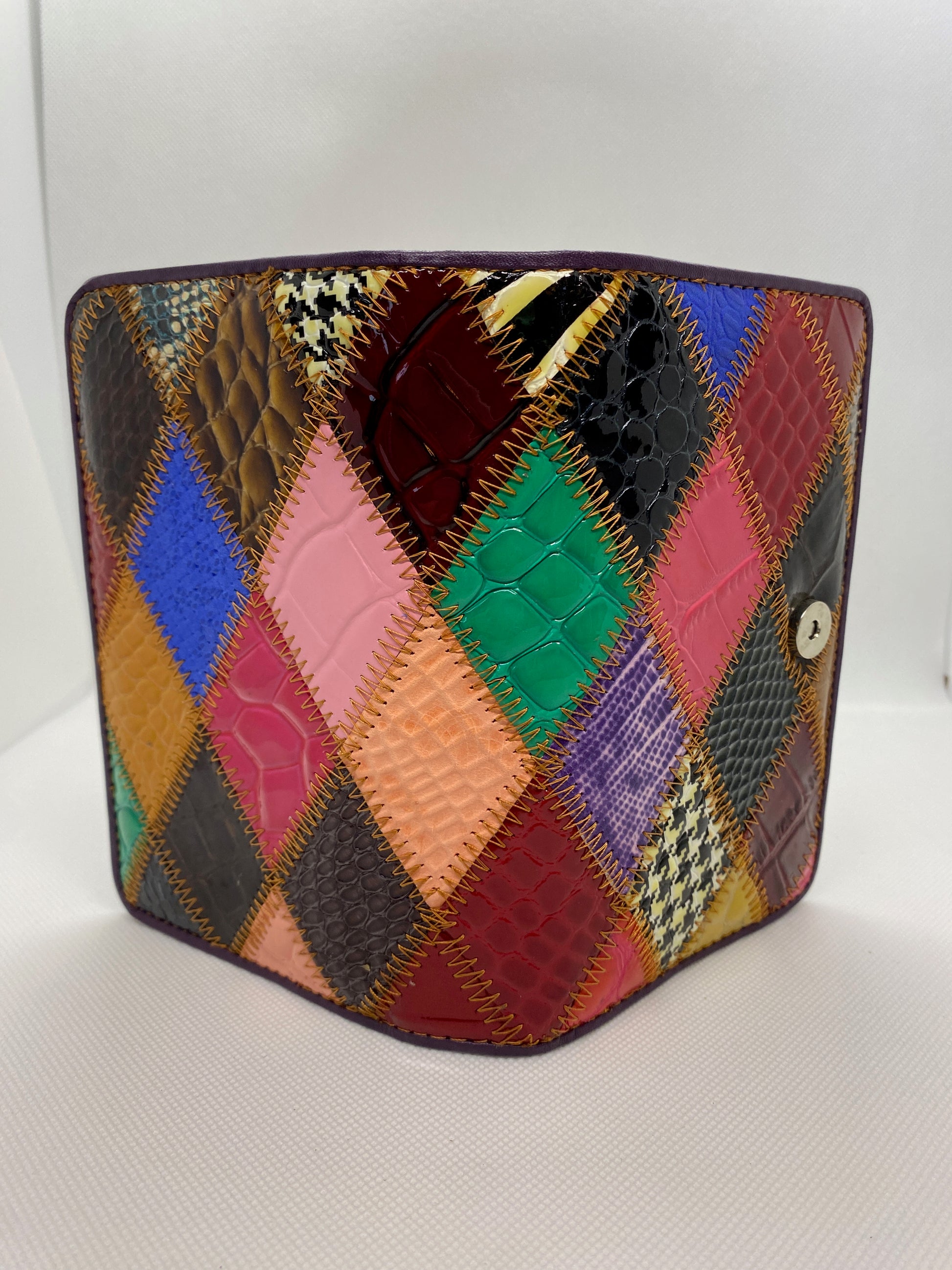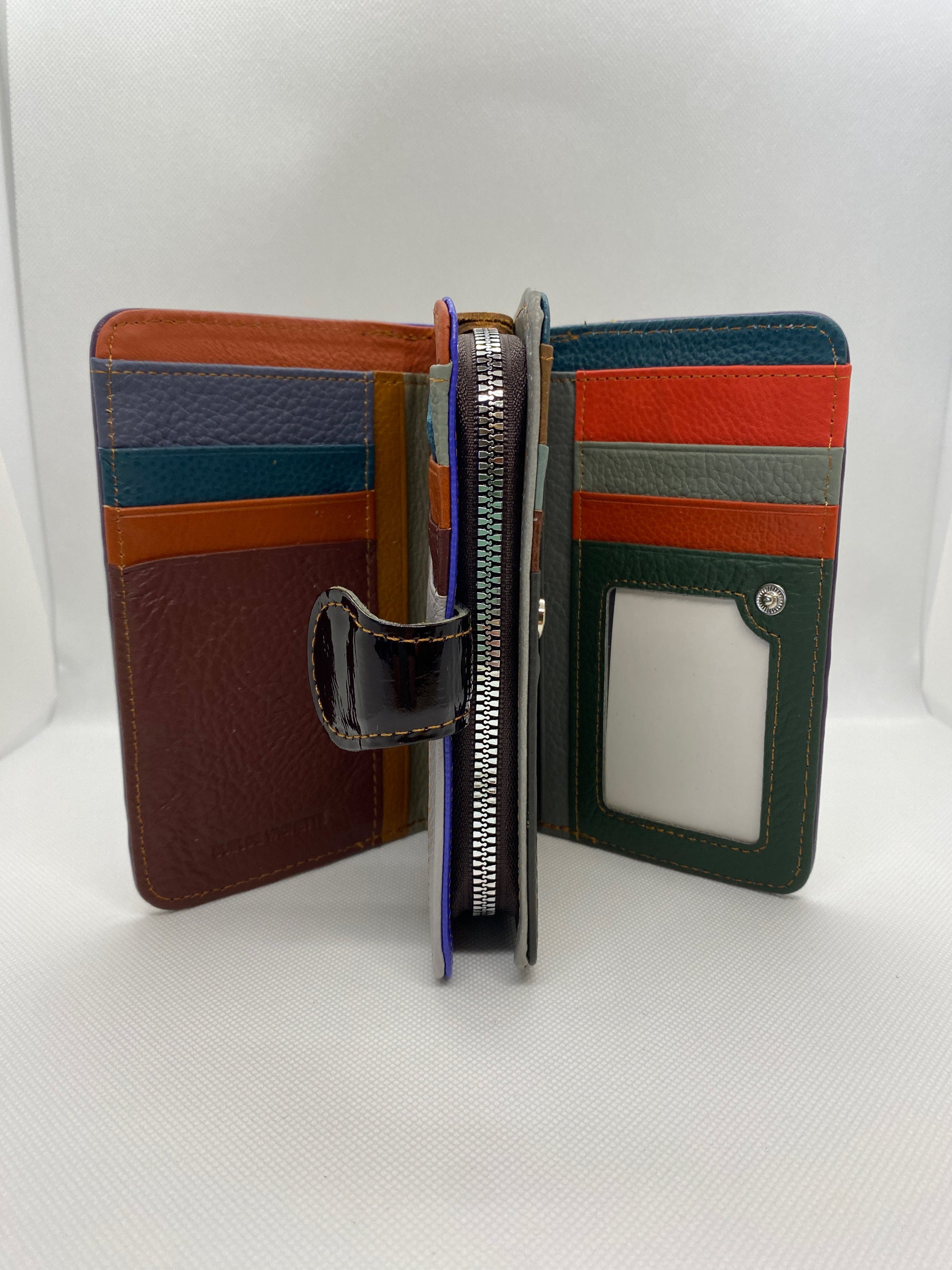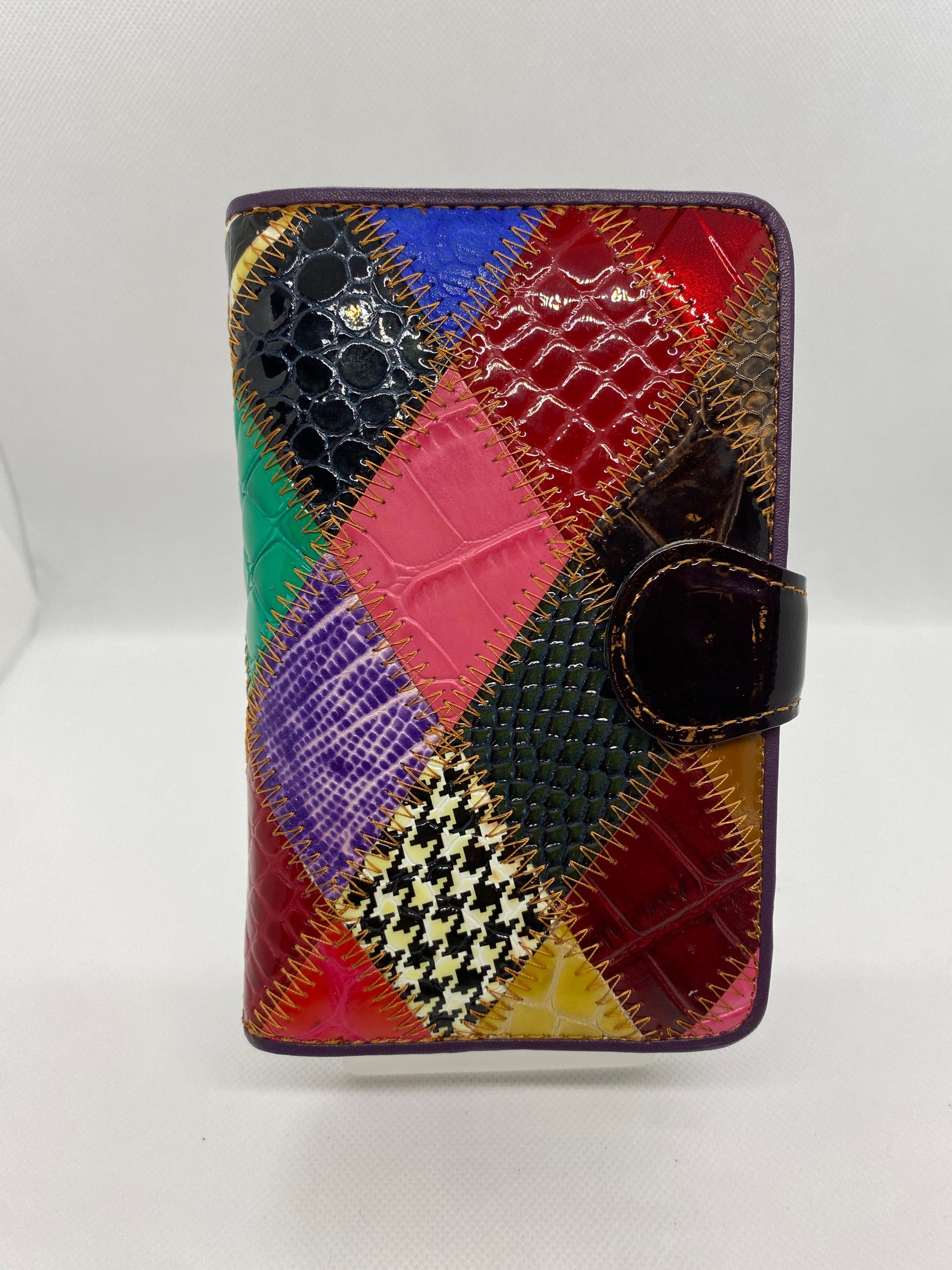 Un véritable accessoire de mode en cuir vernis, très chic. Distingué, il fait la différence. Bien conçu avec ses 3 parties et ses nombreuses options il est pratique et sera vite indispensable. C’est le portefeuille qu’il vous faut. Fermé des 2 côtés par de bons boutons pressions, il s’ouvre sur 4 cartes d’un côté et 4 de l’autre, avec poche pour insérer vos papiers au-dessous. Au centre, porte-monnaie double pour vos billets et votre monnaie. Et vous découvrirez en plus 10 poches doubles ou simples, astucieusement réparties. Cuir vachette, doublé textile. 10 x 16 cm, ép. 5 cm env. Coloré et sophistiqué il est unique ! Livré en boîte cadeau.