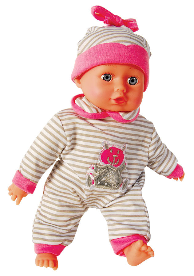 Ce joli poupon en matière souple et douce sera le meilleur compagnon des enfants. Dans son joli body et avec sa bouille souriante, il attend les câlins et s’endormira avec eux. A partir de 18 mois. Taille : 26 cm