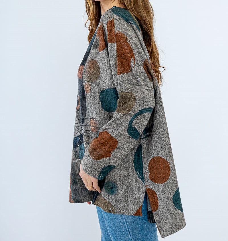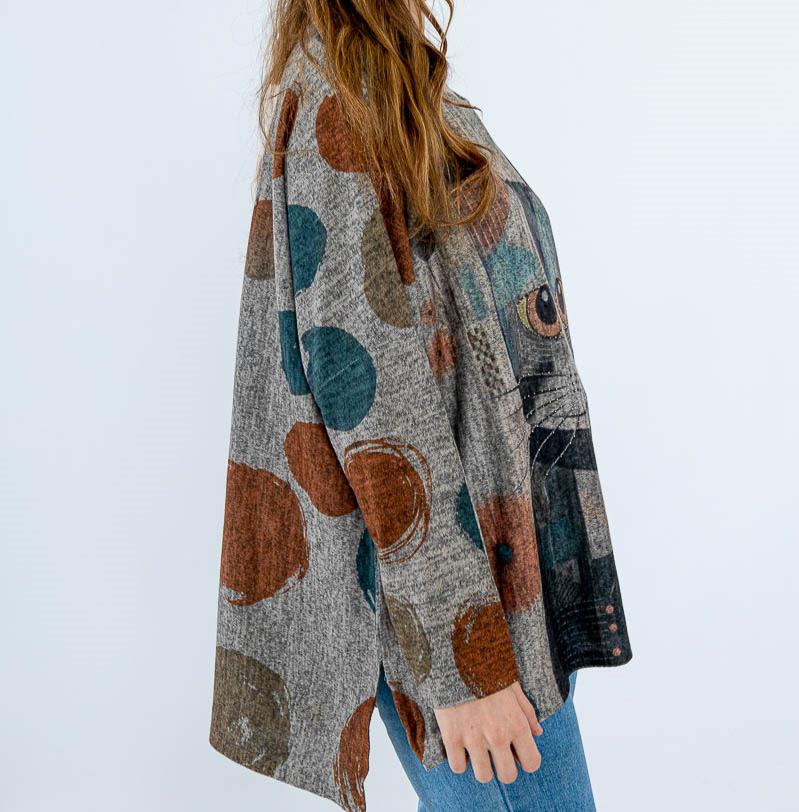 Sous la protection de la Déesse chatte Bastet.. cette magnifique tunique vous calinera. Une calinothérapie qui vous apportera une sensation de bien-être dès que vous la porterez. Un monde coloré de douceur avec cette chatte majestueuse et protectrice. Son design est unique ! 65% viscose, 30% acrylique, 5% élasthane
