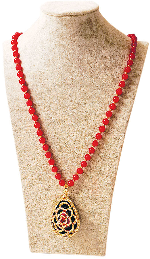 Très séduisante, cette belle goutte est d’un rouge incandescent dont la profondeur varie selon la lumière. Perles d’Agate, Cristal, strass. 70 cm, pendentif 7 cm