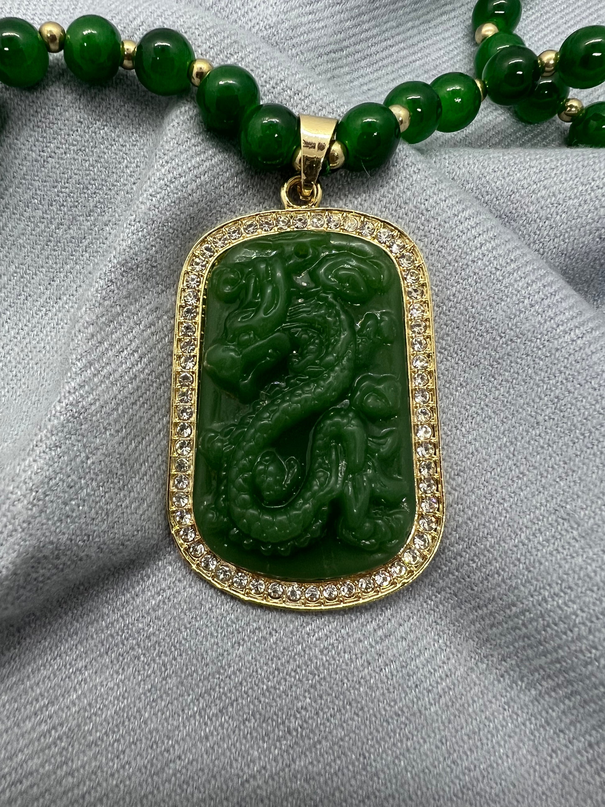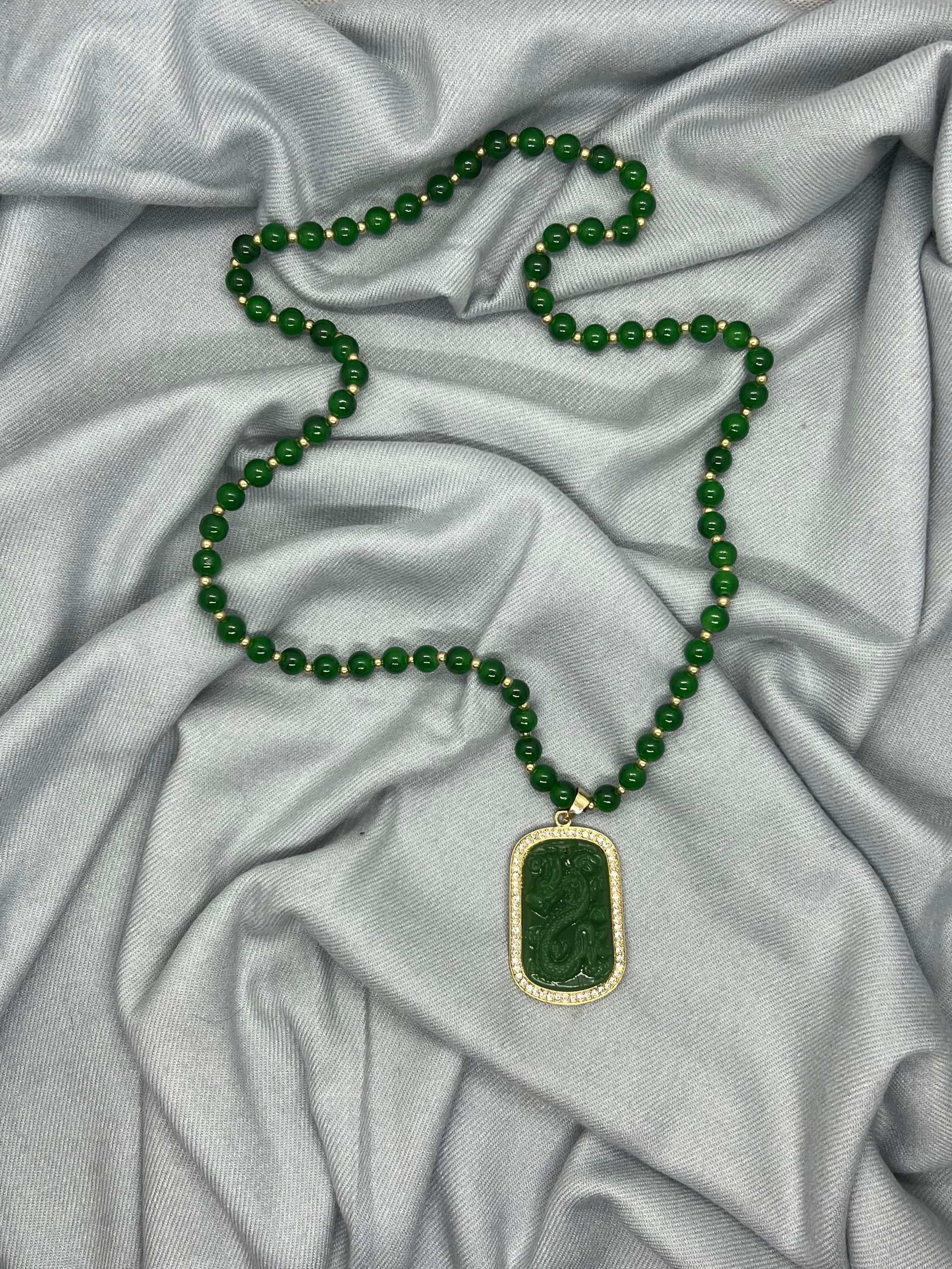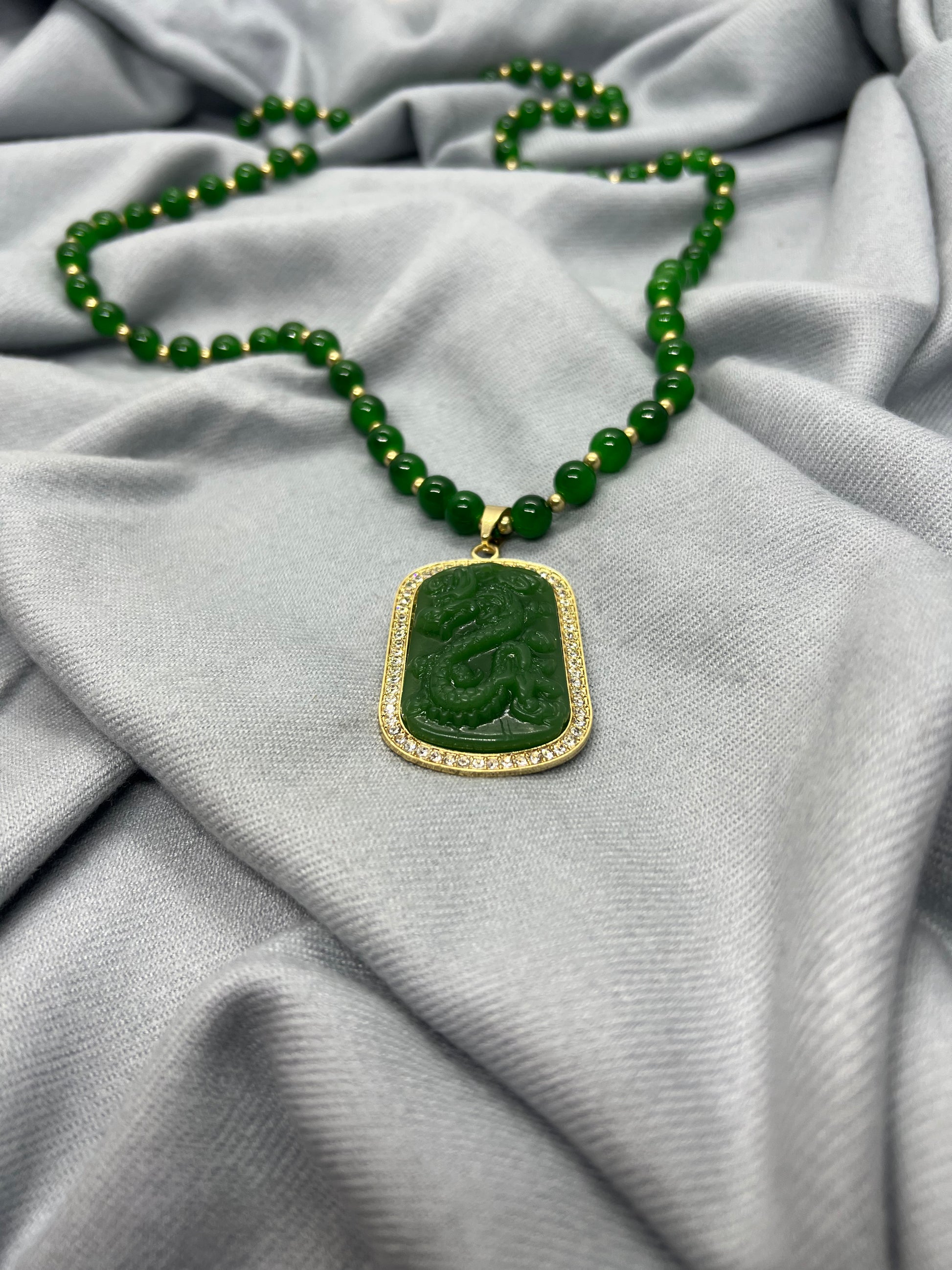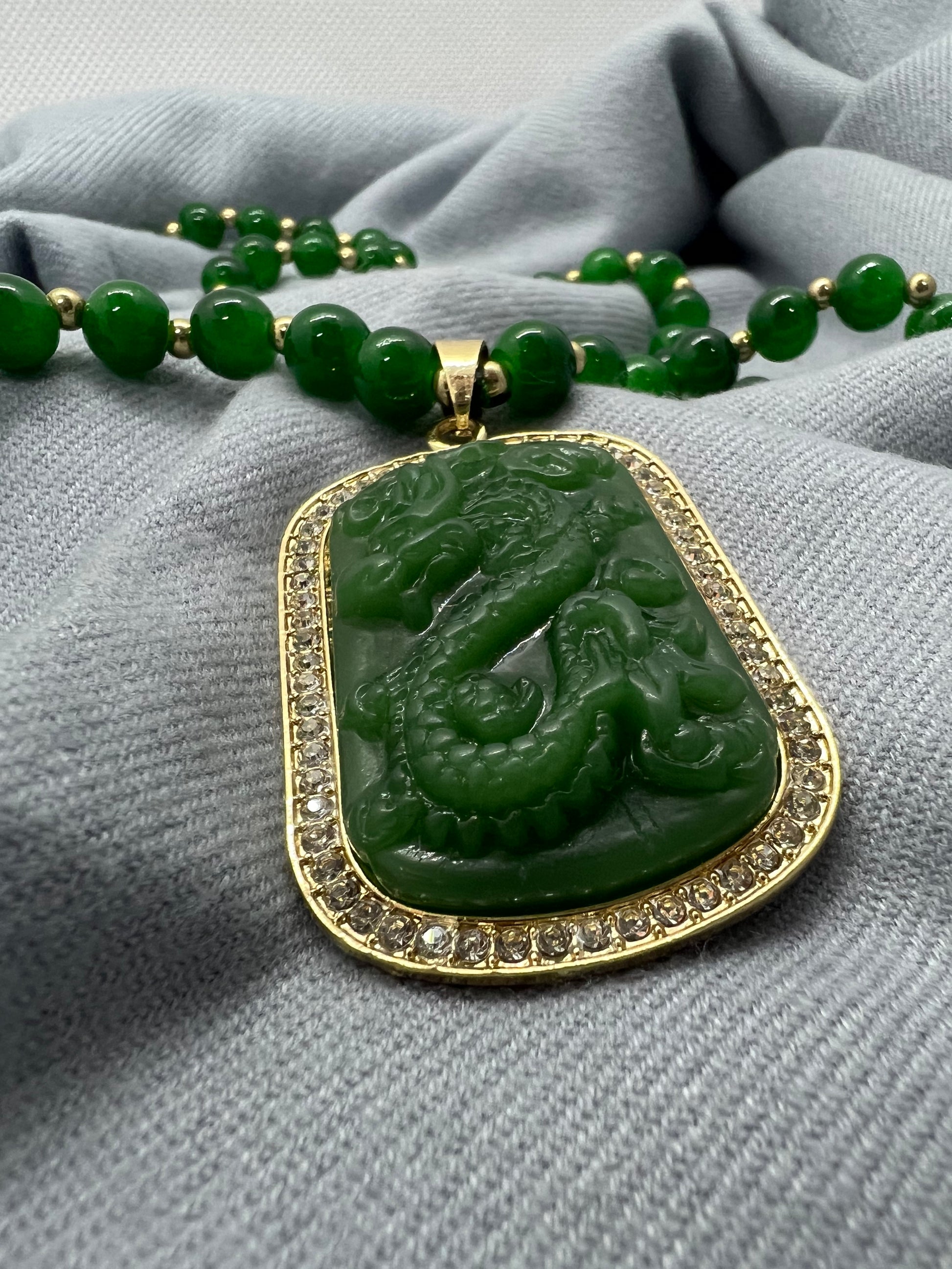 Symbole de vie et de puissance, le dragon apparaît ici dans la splendide évocation d’un jade sculpté de la plus grande finesse. 70 cm, pendentif 5,5 cm