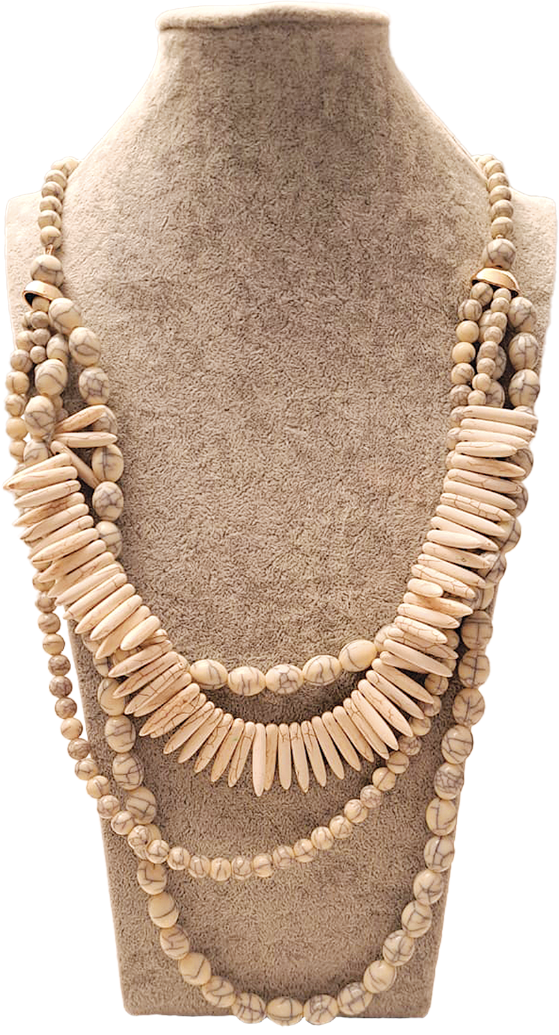 | Un collier somptueux qui donne l'impression d'être dans les îles, très loin au soleil. Coquillages ou dents de la mer… tout en légèreté. 90 cm + chaîne d'appoint 5 cm |