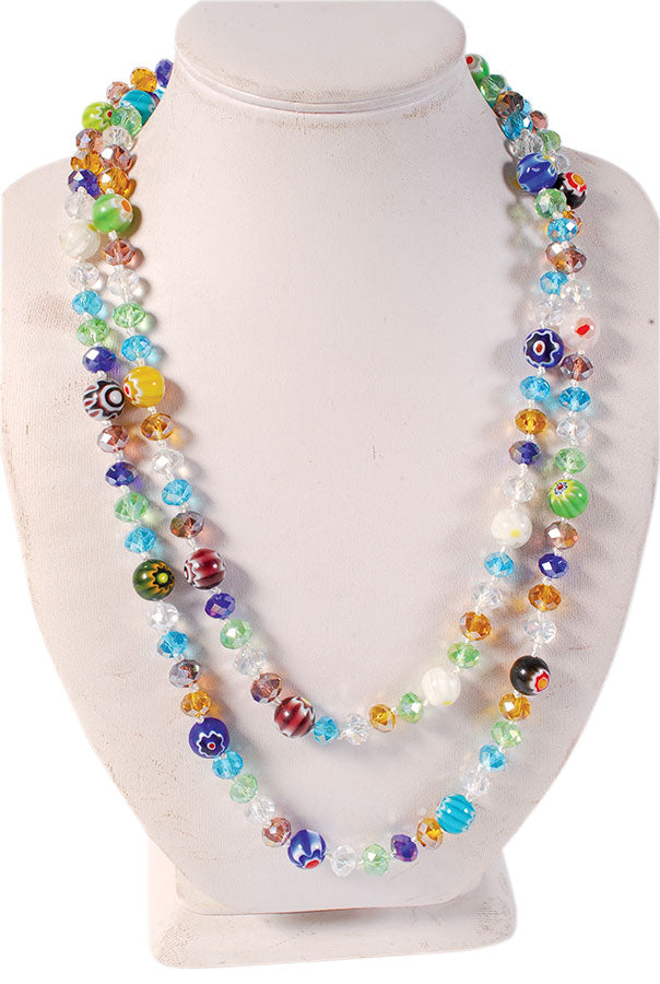 Un assemblage très varié et réussi de perlines travaillées et murrines rondes dans le plus pur esprit de Murano. Le verre dans tous ses états ! L. 120 cm environ