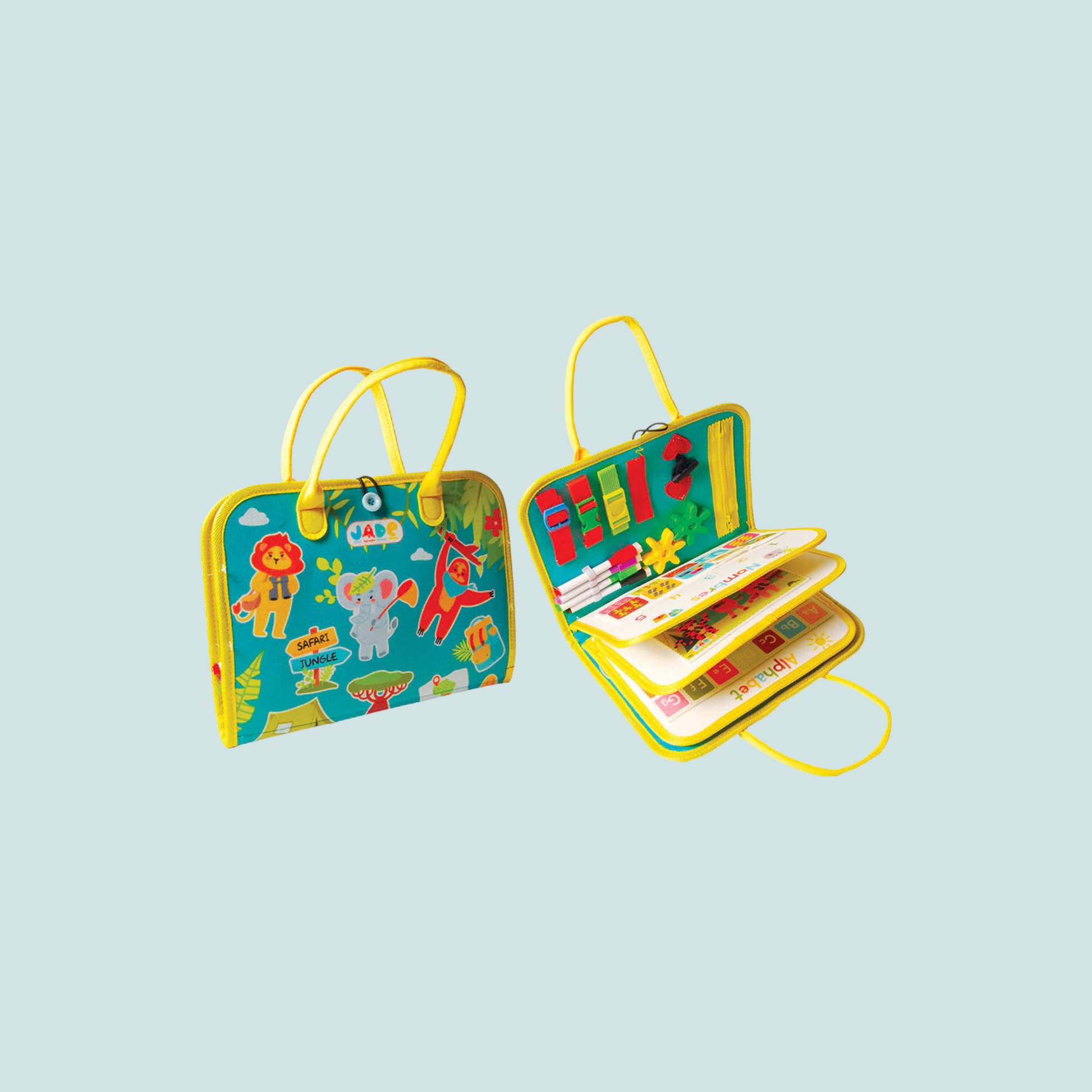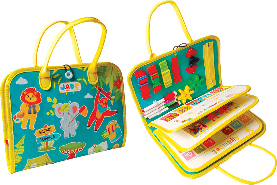 Le petit cartable idéal, véritable pochette éducative équipée de 7 activités sensorielles pour développer a motricité de chaque enfant. Les couleurs, les chiffres, l’alphabet, les animaux, etc., avec puzzle safari en bonus ! Design français. 22 x 30 cm
