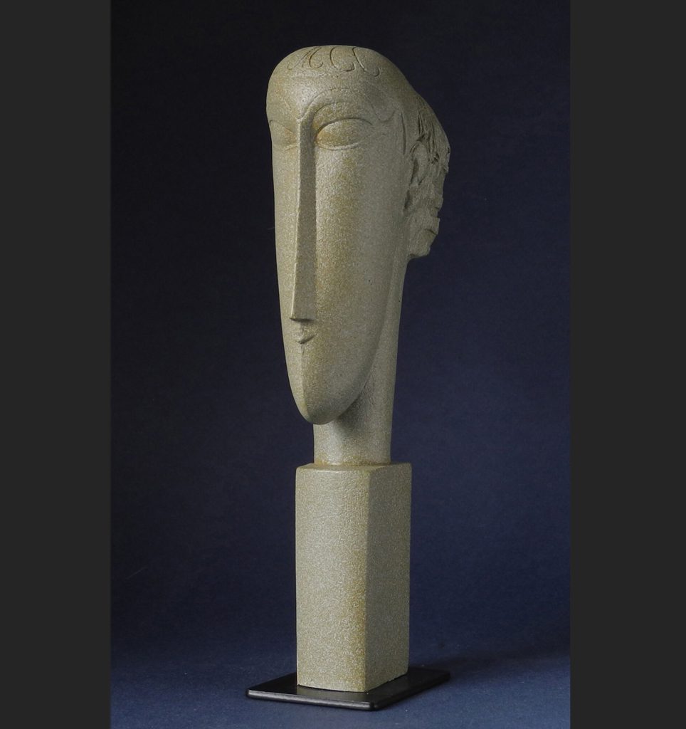 Amédéo Modigliani (1884-1920). Cette tête s’exprime dans un nouveau langage esthétique en étroite relation avec l’art nègre. C’est en effet dans cet art nouvellement découvert et décodé par de célèbres théoriciens et critiques comme Carl Einstein que l’artiste italien, disparu prématurément à l’âge de 35 ans, a puisé son inspiration, sous l’influence de Picasso et Matisse. Résine