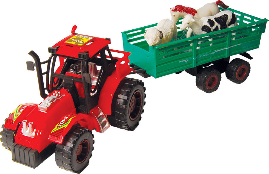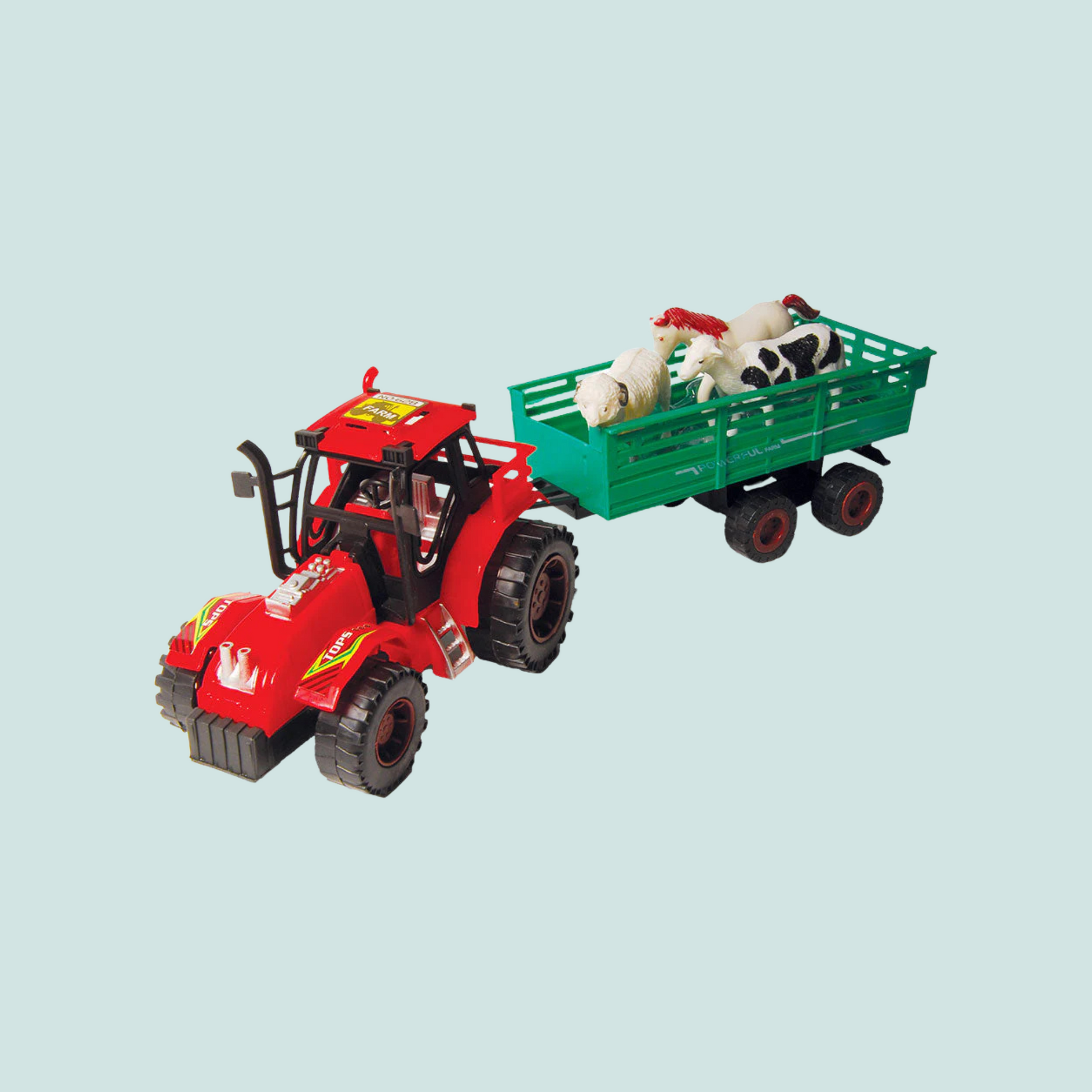 Monte à bord de ton tracteur et pars à la ferme ! Tu vas t’amuser avec tes amis les animaux : une vache, un mouton et un cheval. Ils sont dans la remorque et tu peux les sortir pour jouer avec eux. Fais avancer ton tracteur à friction et écoute-le faire du bruit ! Plastique - L. 33 cm. A partir de 3 ans.