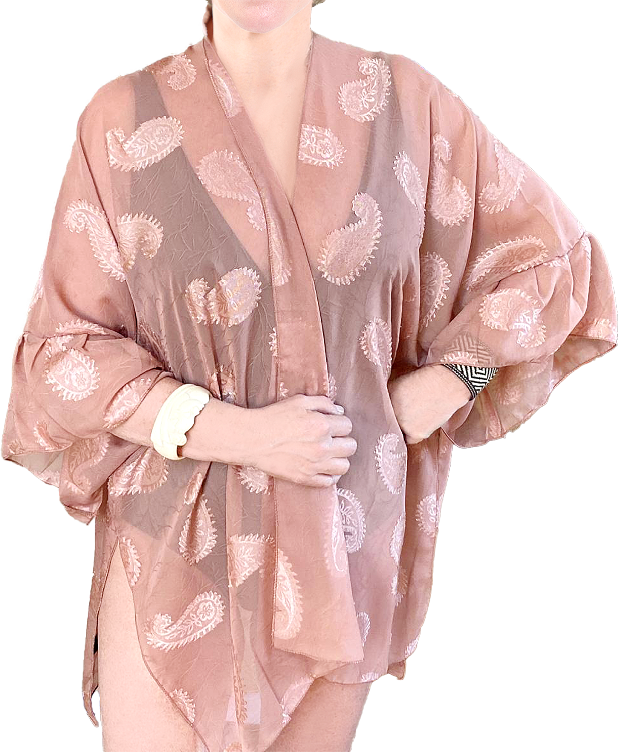 Idéale pour sublimer votre allure. Se porte sur une robe, une chemise, un tee-shirt ou un maillot. Sa coupe élégante avec ses fentes sur les côtés et ses larges demi-manches à volants a belle allure. Elle apportera avec sa transparence et ses motifs Paisley une belle touche de raffinement à votre tenue. Se porte selon l’envie chez soi ou pour une sortie habillée. Taille unique L. dos 70 cm – 100 % viscose.