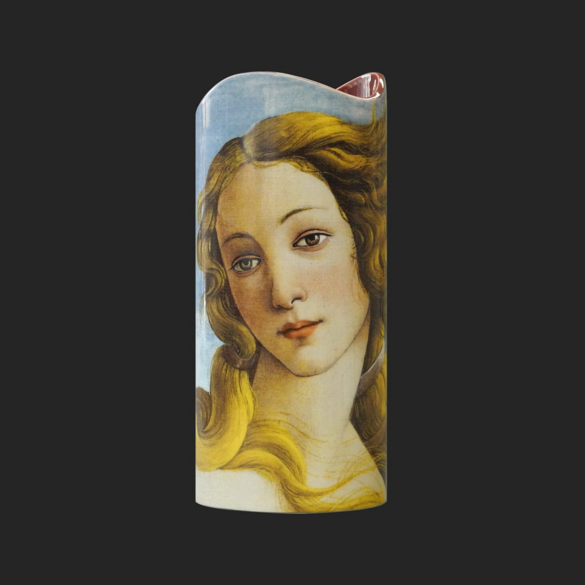 Ce vase reprend le visage du fameux tableau de Boticelli « La naissance de Vénus » (1486). Sans doute l’un des tableaux les plus célèbres de la Renaissance italienne qui fascine toujours aujourd’hui. Boticelli y a caché son amour. En effet, il était amoureux fou de l’épouse du noble Marco Vespucci qui posa pour la Naissance de Vénus. Elle décéda très jeune, dix ans avant Botticelli, qui fut à sa demande inhumé à ses pieds dans l’église d’Ognissant. Céramique - H. 23,5, D. 10 cm.Livré avec brochure
